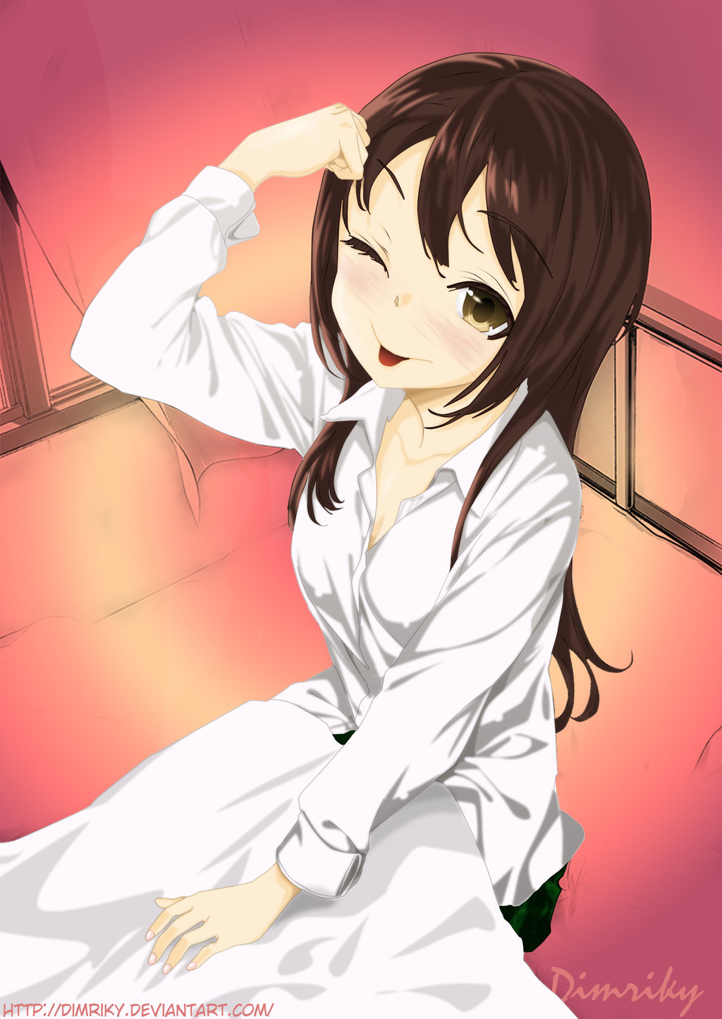 Description: A woman sitting on a bed in a white shirt and black skirt with her hand on her head and her hand on her head.