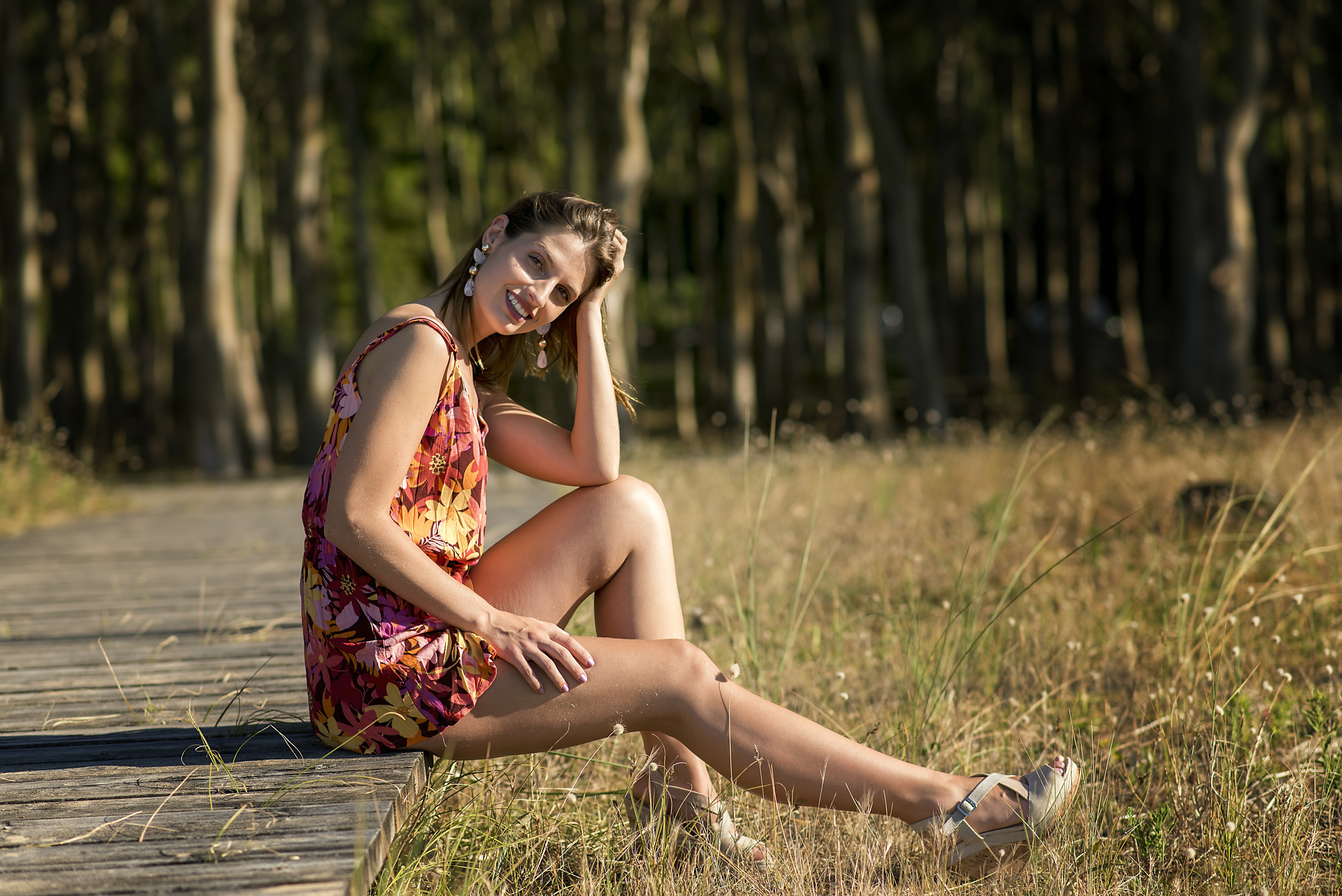 Description: A woman sitting on a wooden walkway in a field of grass and tall grass.