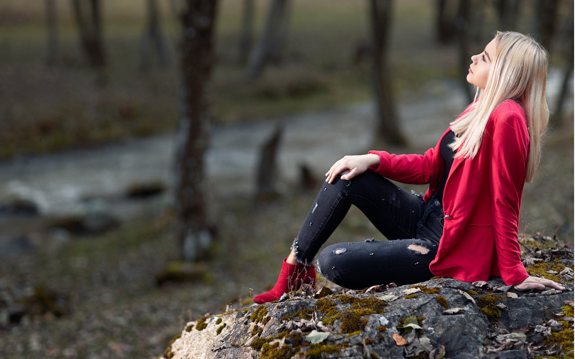 Description: A woman sitting on a rock in the woods looking up at the sky and trees in the background.