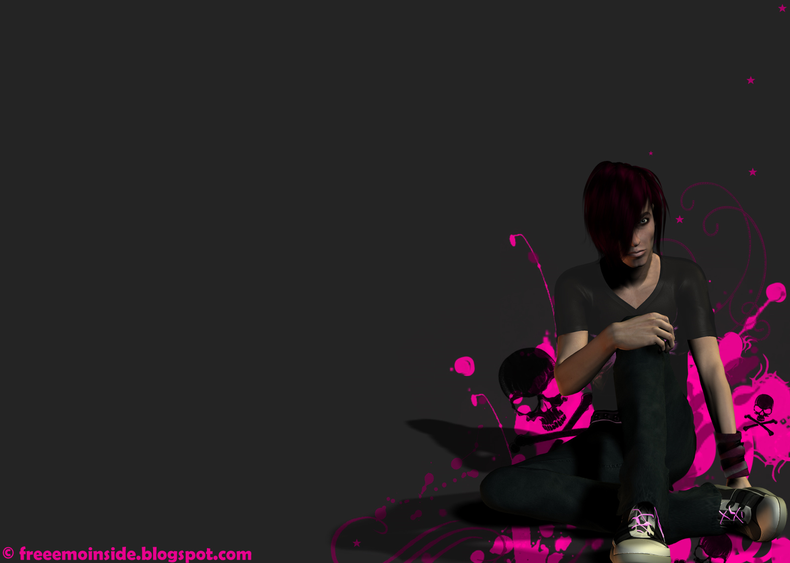 Description: A woman sitting on the ground with a skateboard in her hand and a skull on her chest.