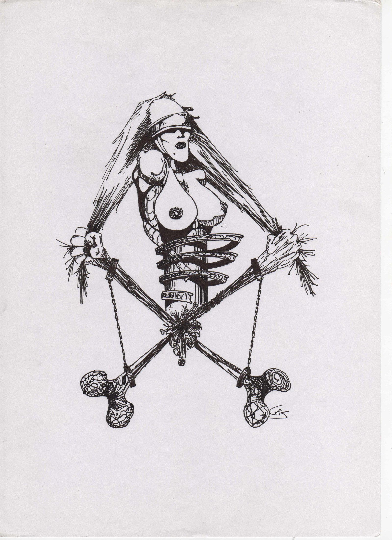 Description: A drawing of a woman with a skeleton holding a sword and a skull on a crossbones with a skull on the bottom.