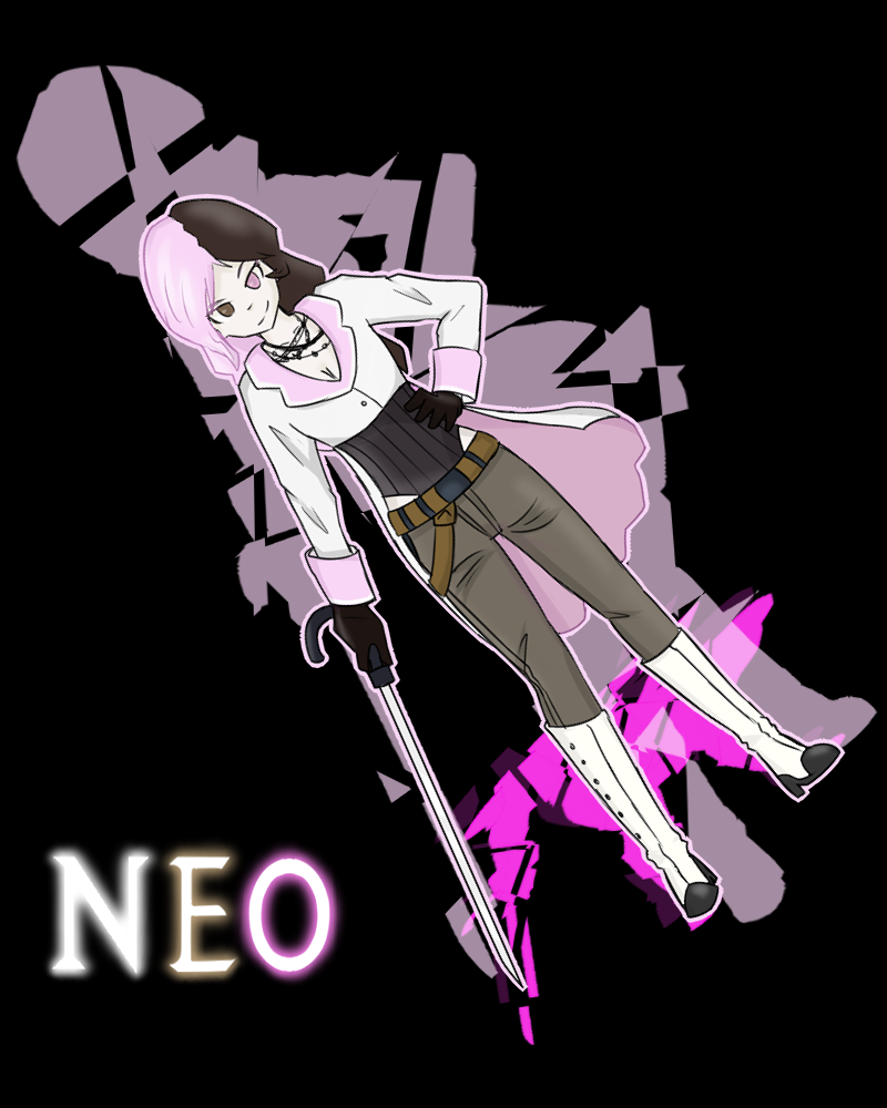 Description: A woman riding skis on top of a purple and black background with the word neo above her head.