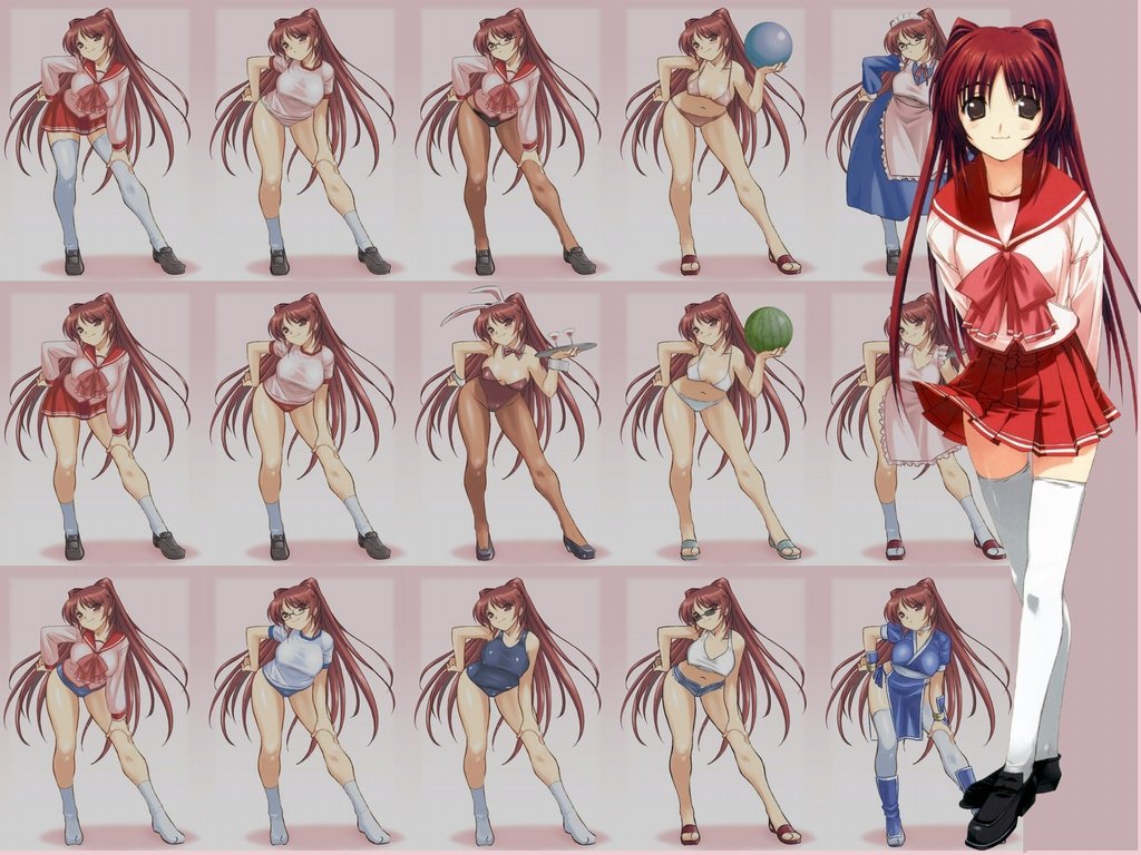 Description: A woman in a short skirt and a red top is standing in front of a bunch of different poses.