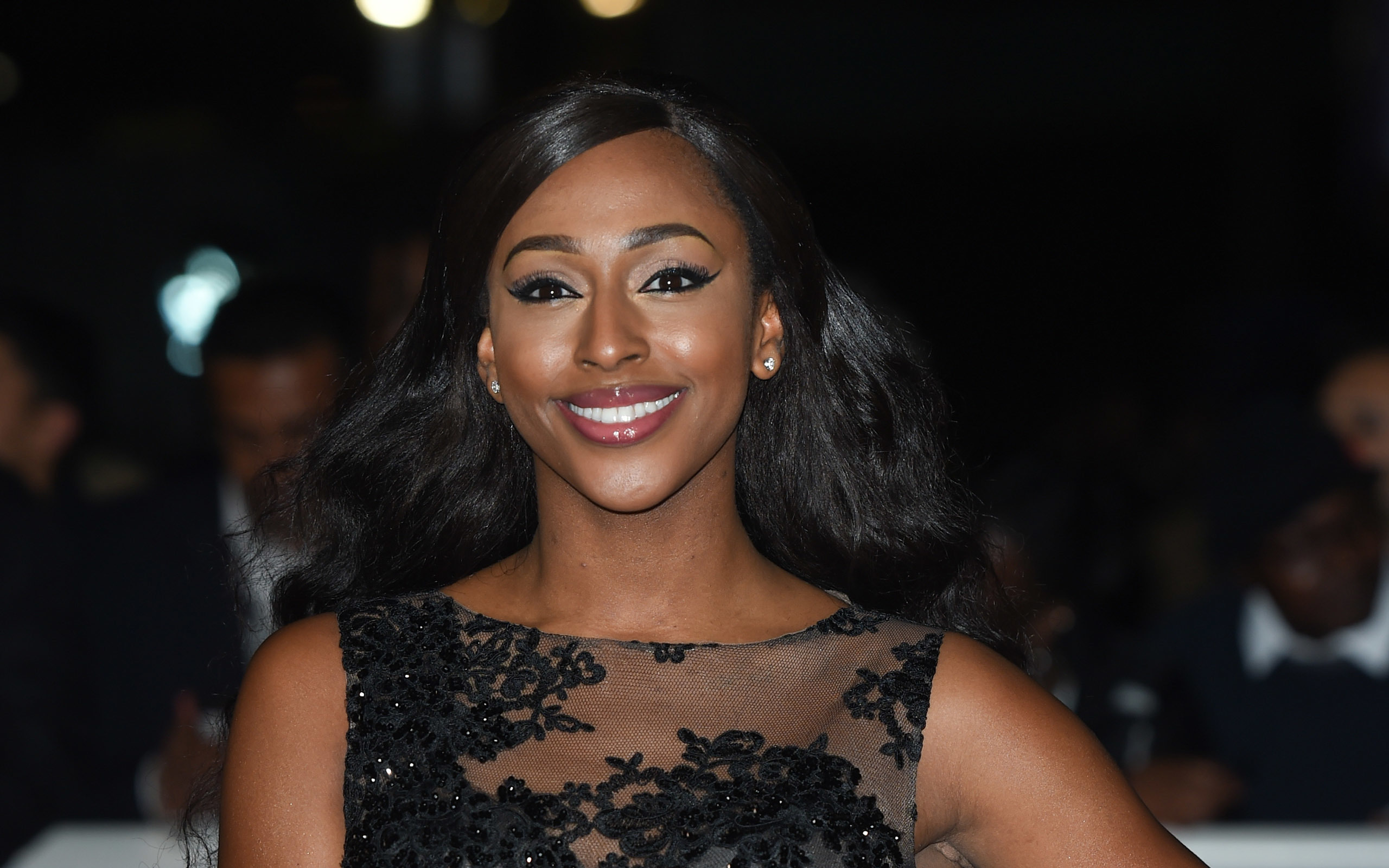 Description: A woman with long hair and a black dress smiling at the camera with a crowd behind her at night.