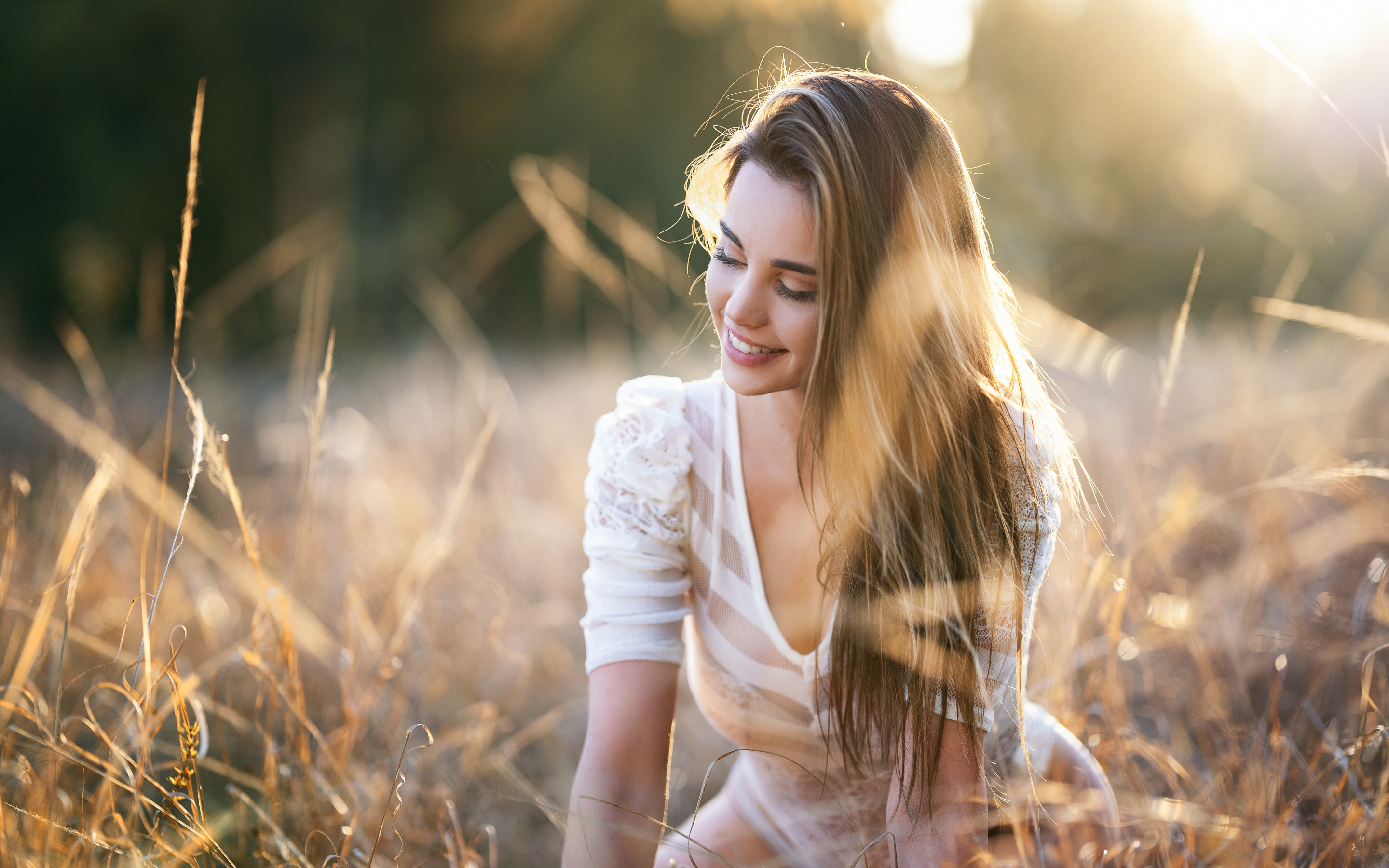 Description: A woman sitting in a field of tall grass smiling at the camera with her hair blowing in the wind.