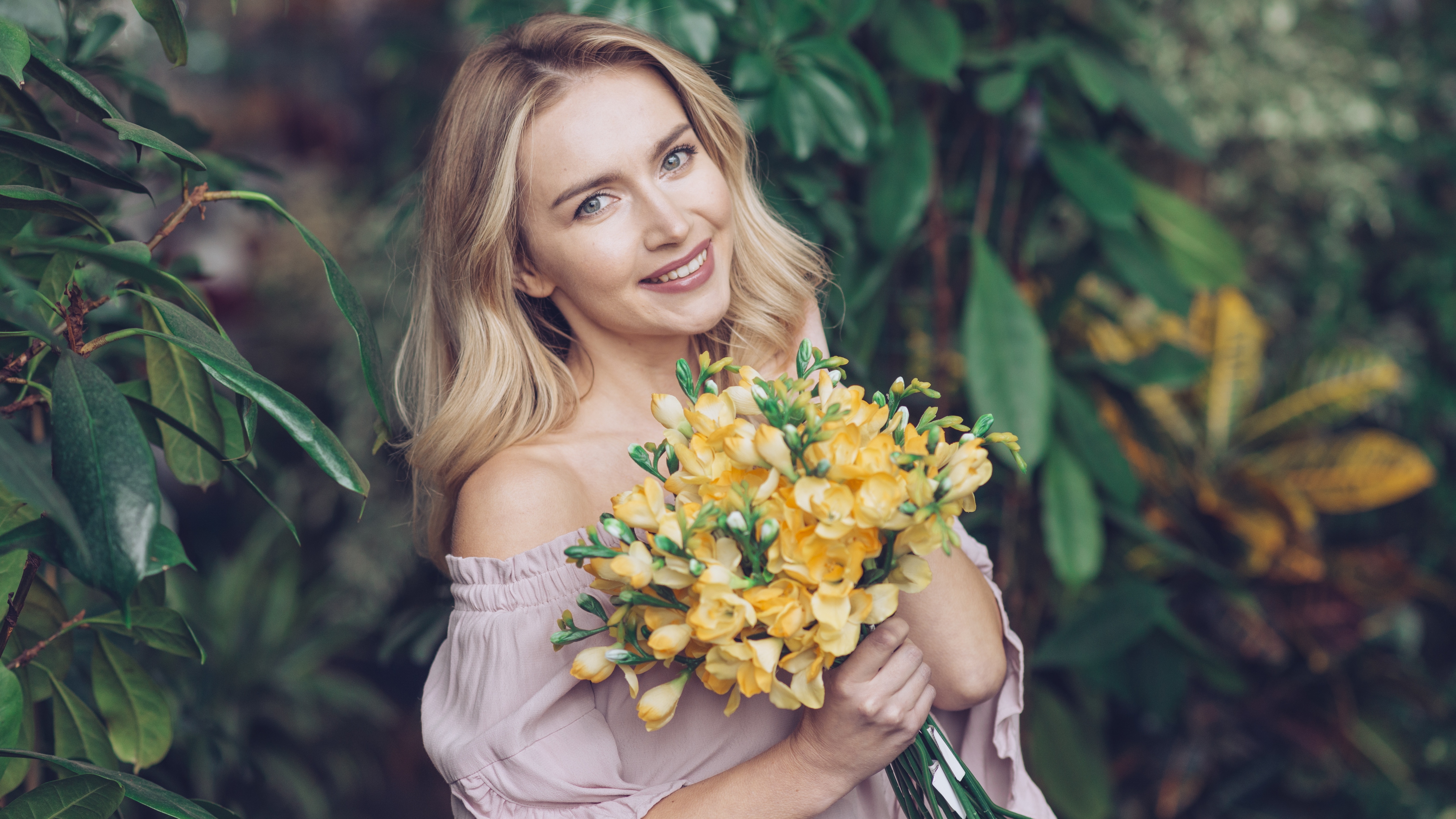 Description: A woman holding a bouquet of flowers in her hands and smiling at the camera with a smile on her face.