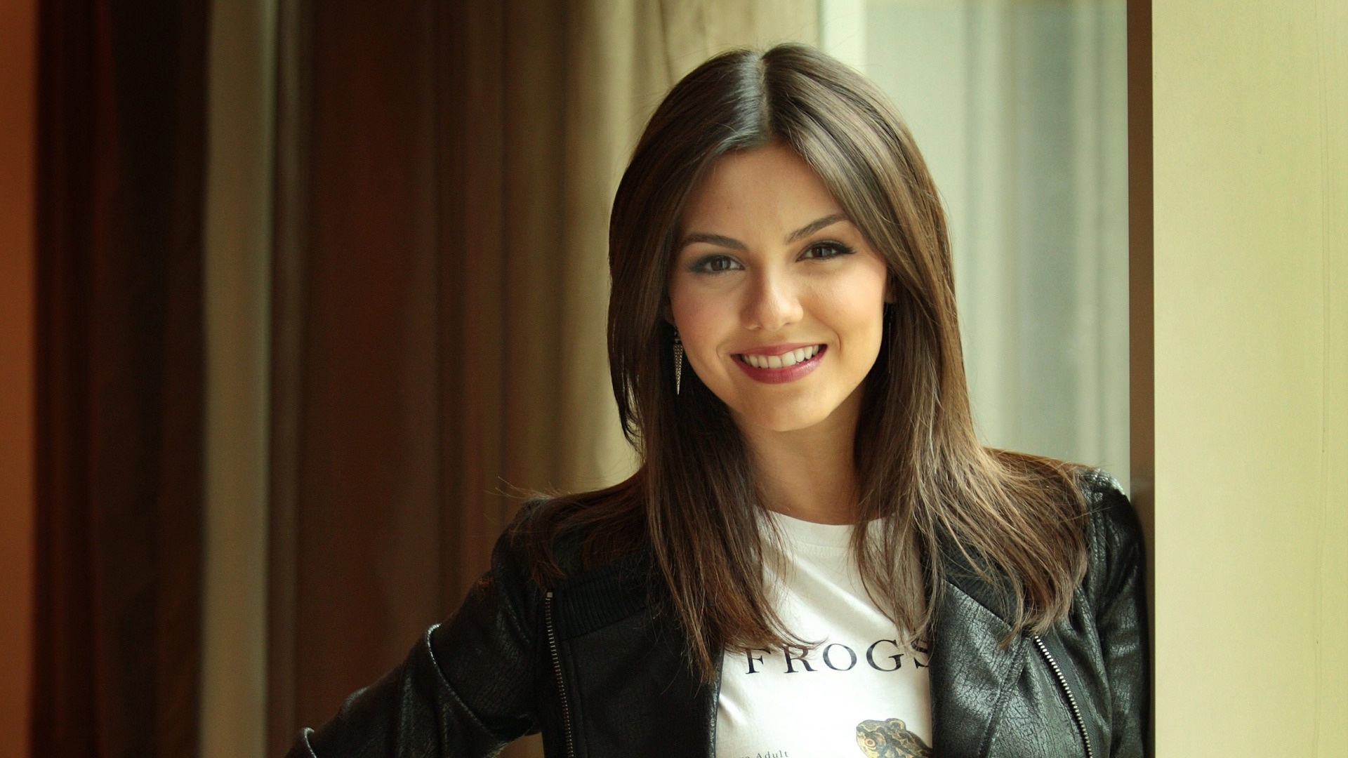 Description: A woman in a black jacket is smiling for the camera while standing in a doorway with a curtain behind her.