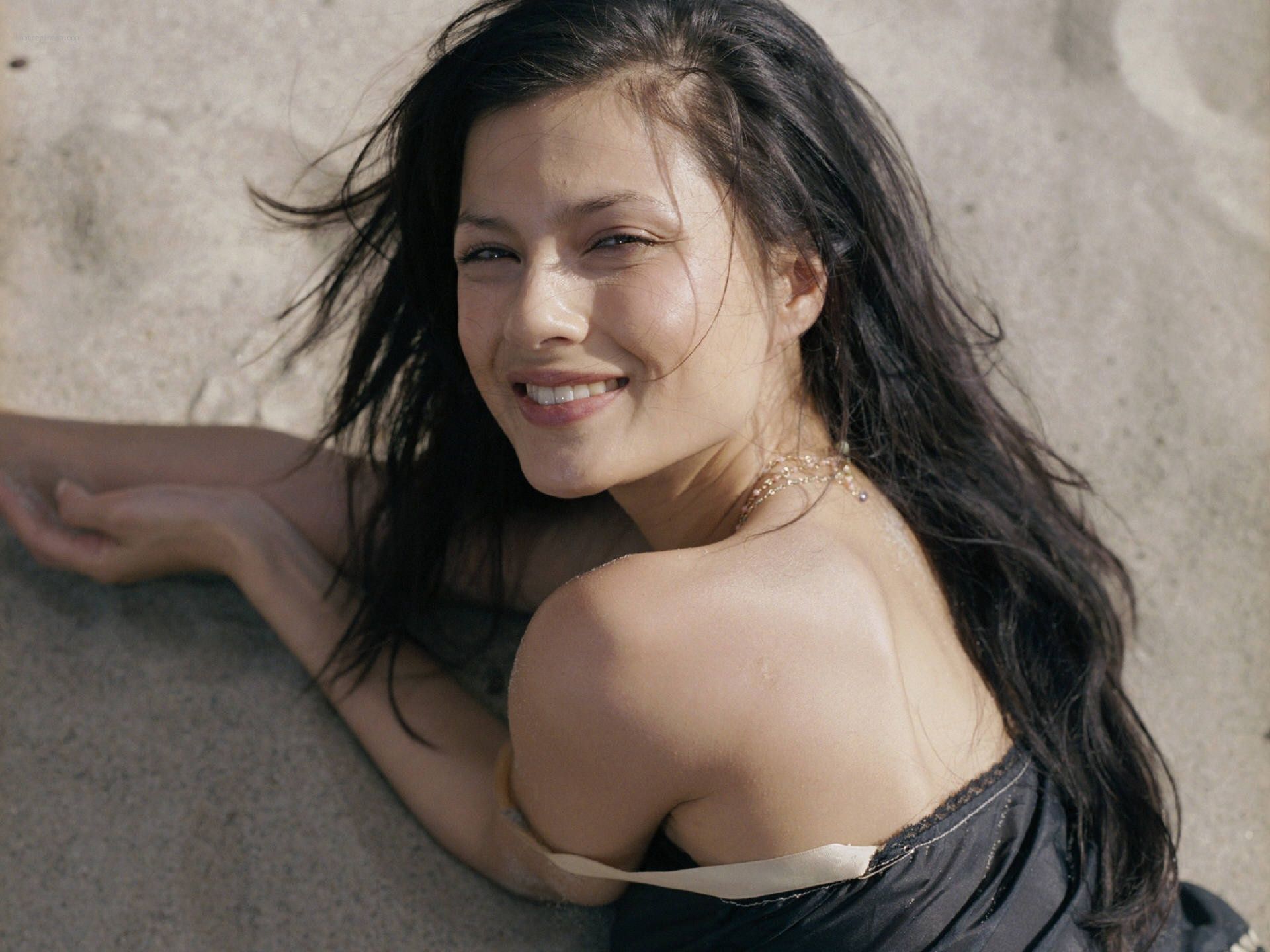 Description: A woman laying on the sand with her hair blowing in the wind and smiling at the camera.