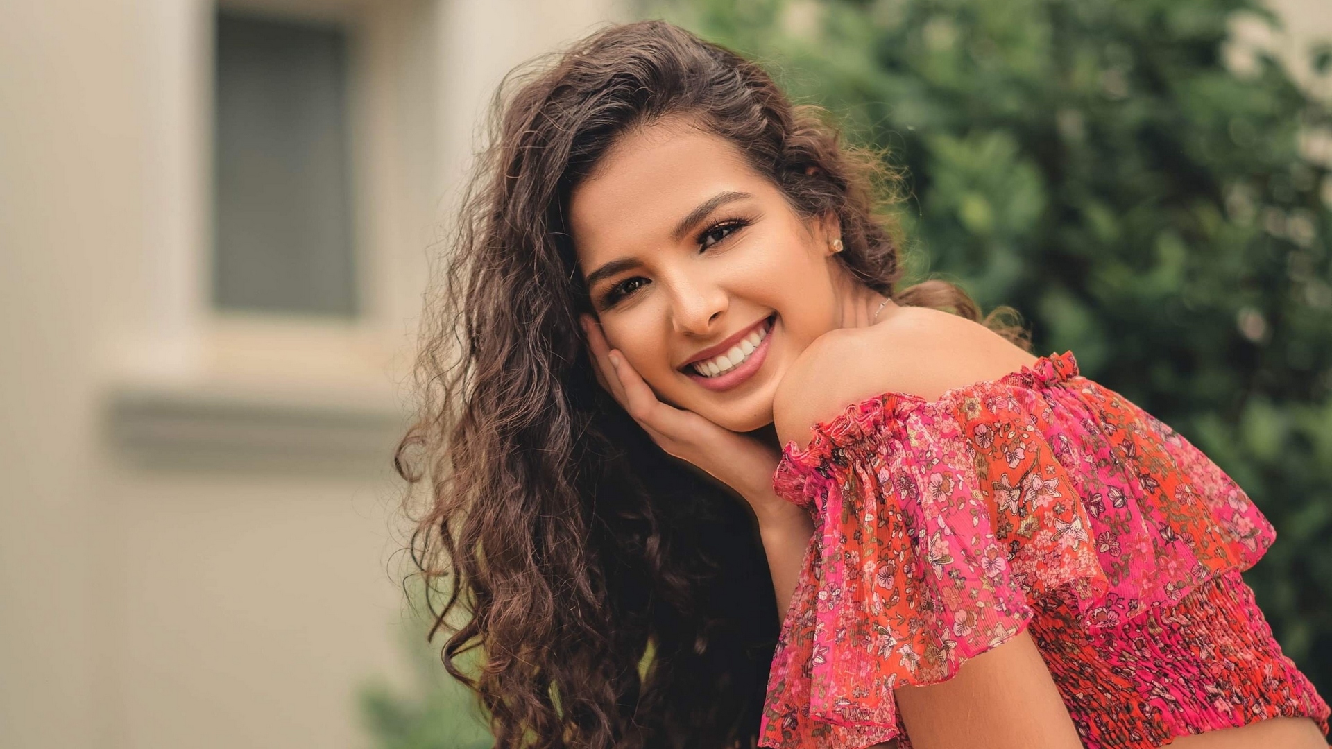 Description: A woman with long hair smiling and wearing a pink top with a floral pattern on it.