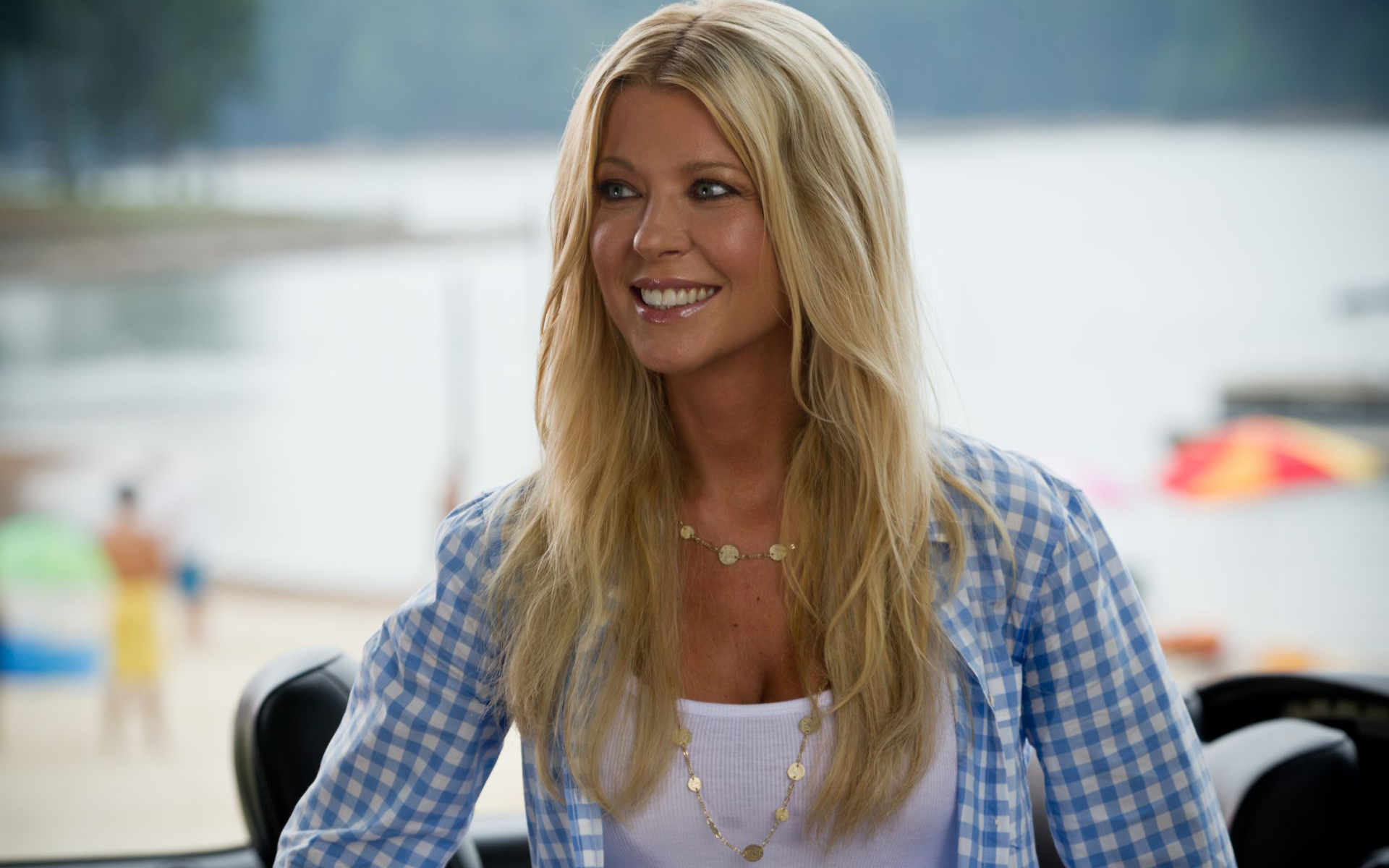 Description: A woman sitting at a table with a smile on her face and a blue and white checkered jacket.