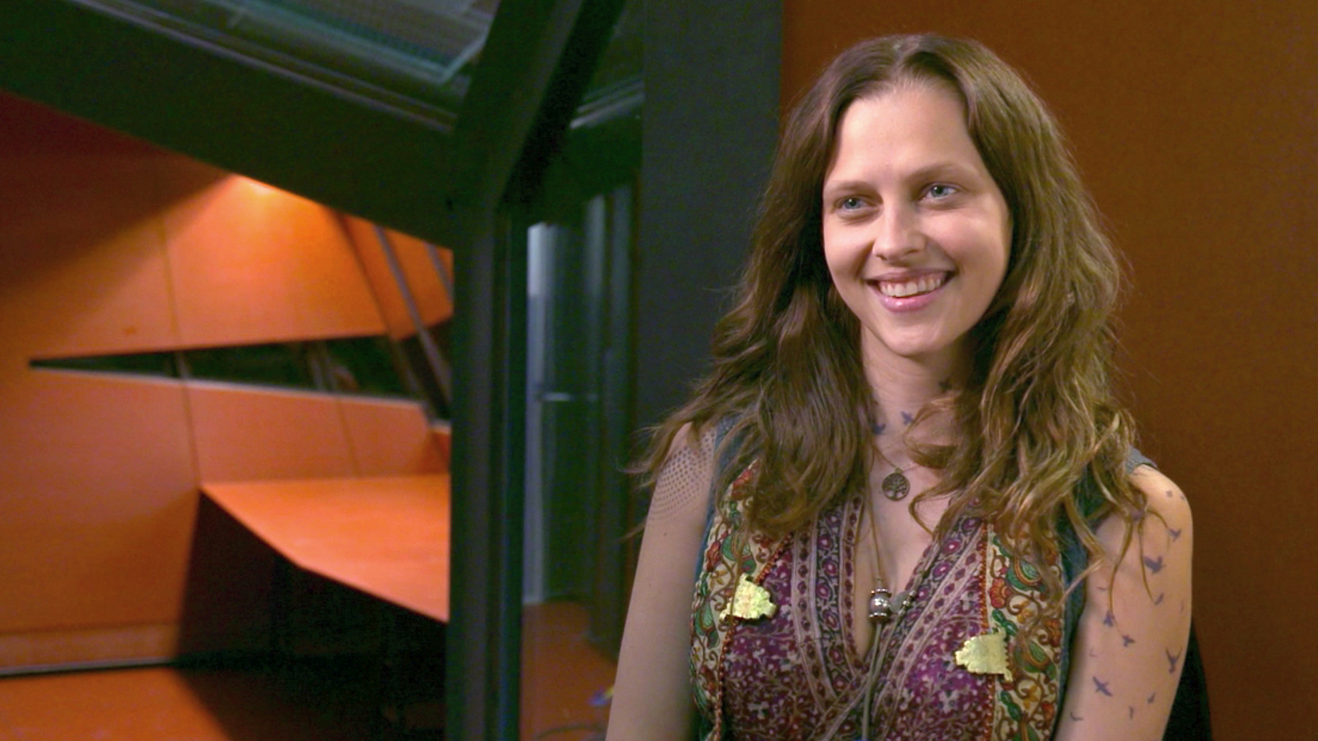 Description: A woman standing in front of a television screen smiling at the camera with a smile on her face and a smile on her face.