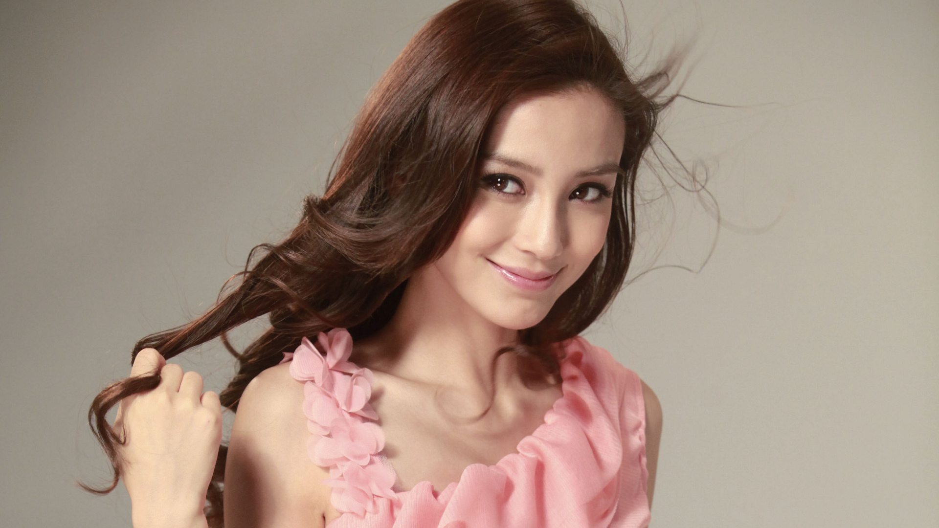 Description: A woman with long hair is smiling and posing for a picture with her hair in the wind and a pink dress.