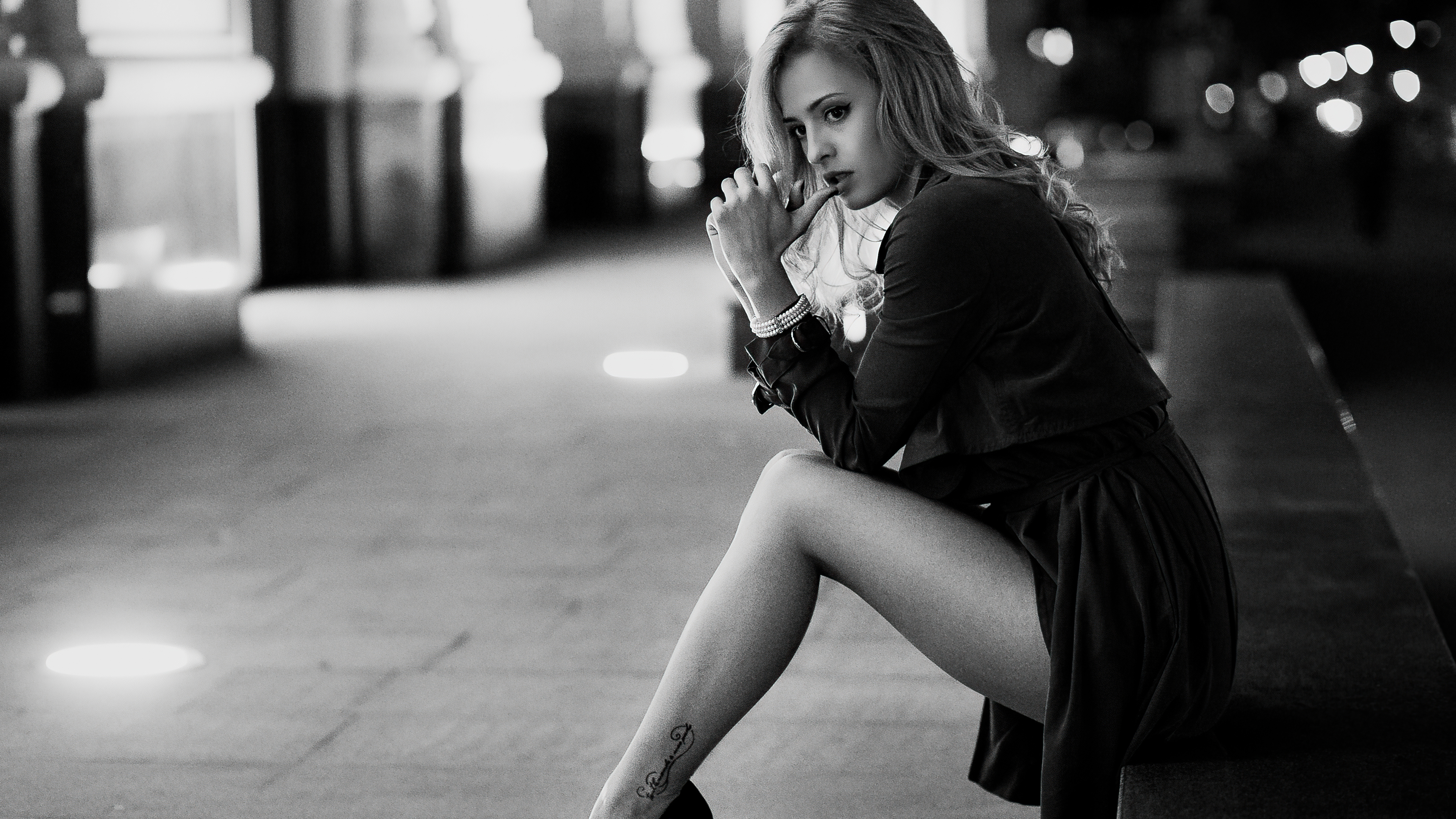 Description: A woman sitting on a curb smoking a cigarette and looking at the camera with a cigarette in her mouth.