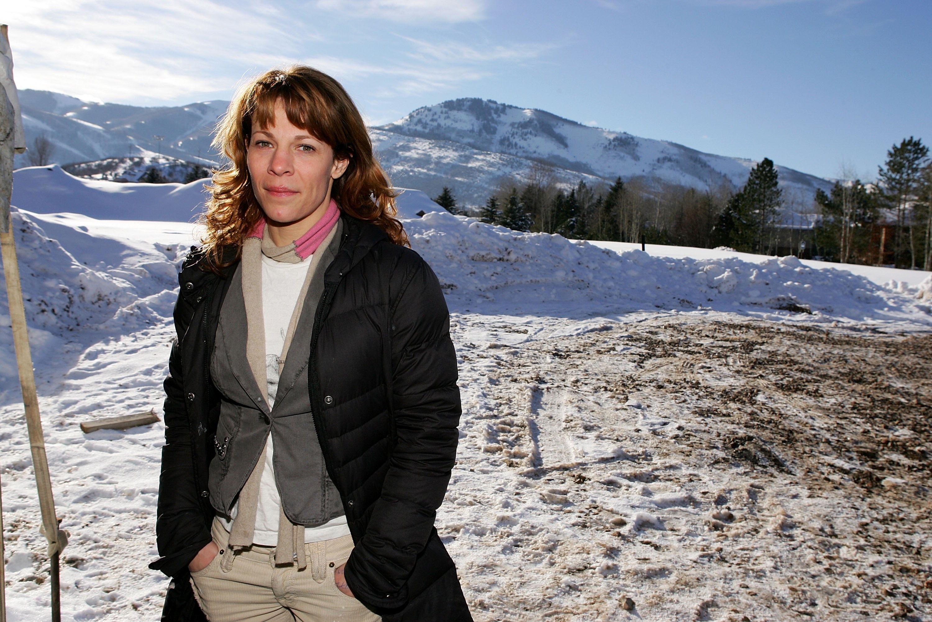Description: A woman standing in the snow with a ski pole in her hand and a mountain in the background with snow on the ground.