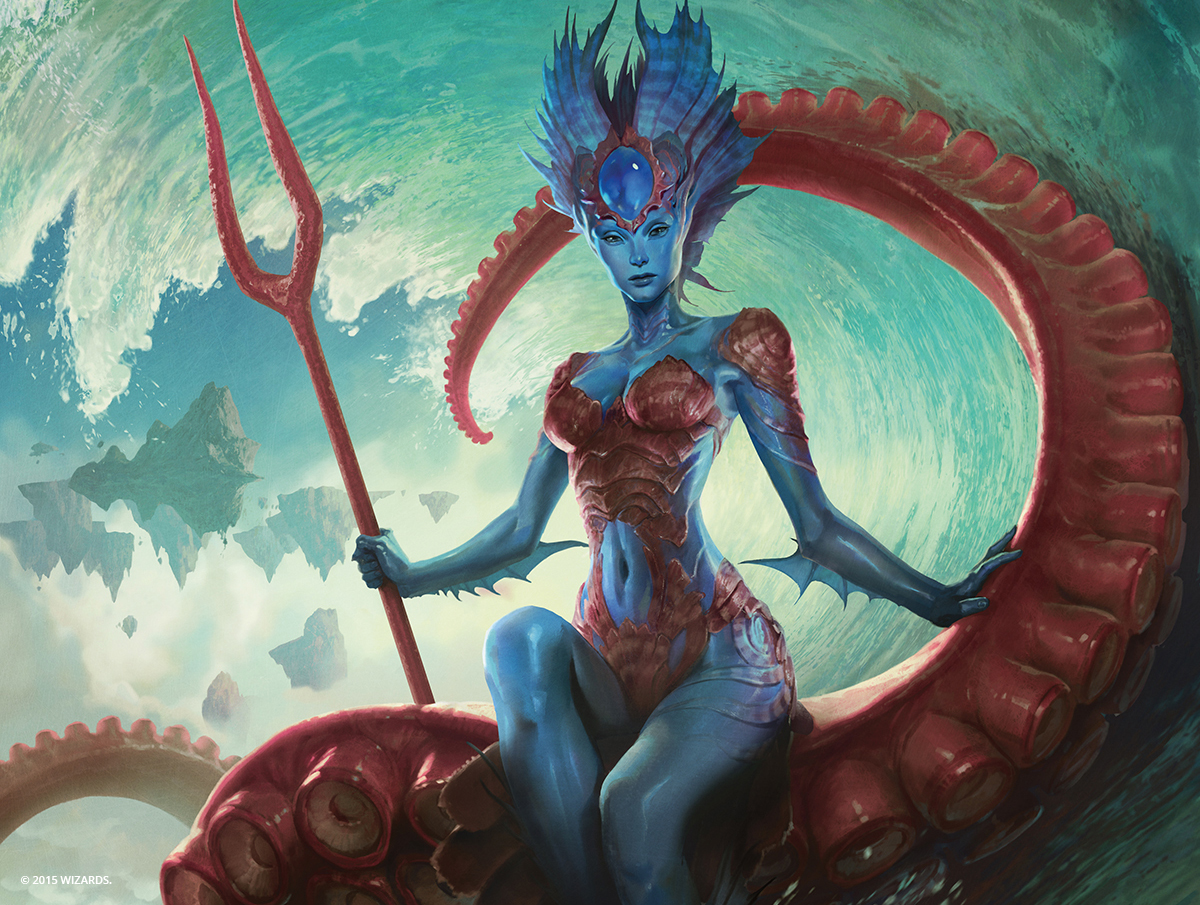 Description: A woman with a spear and a dragon on her back sitting on a giant red octopus like creature with a spear in her hand.