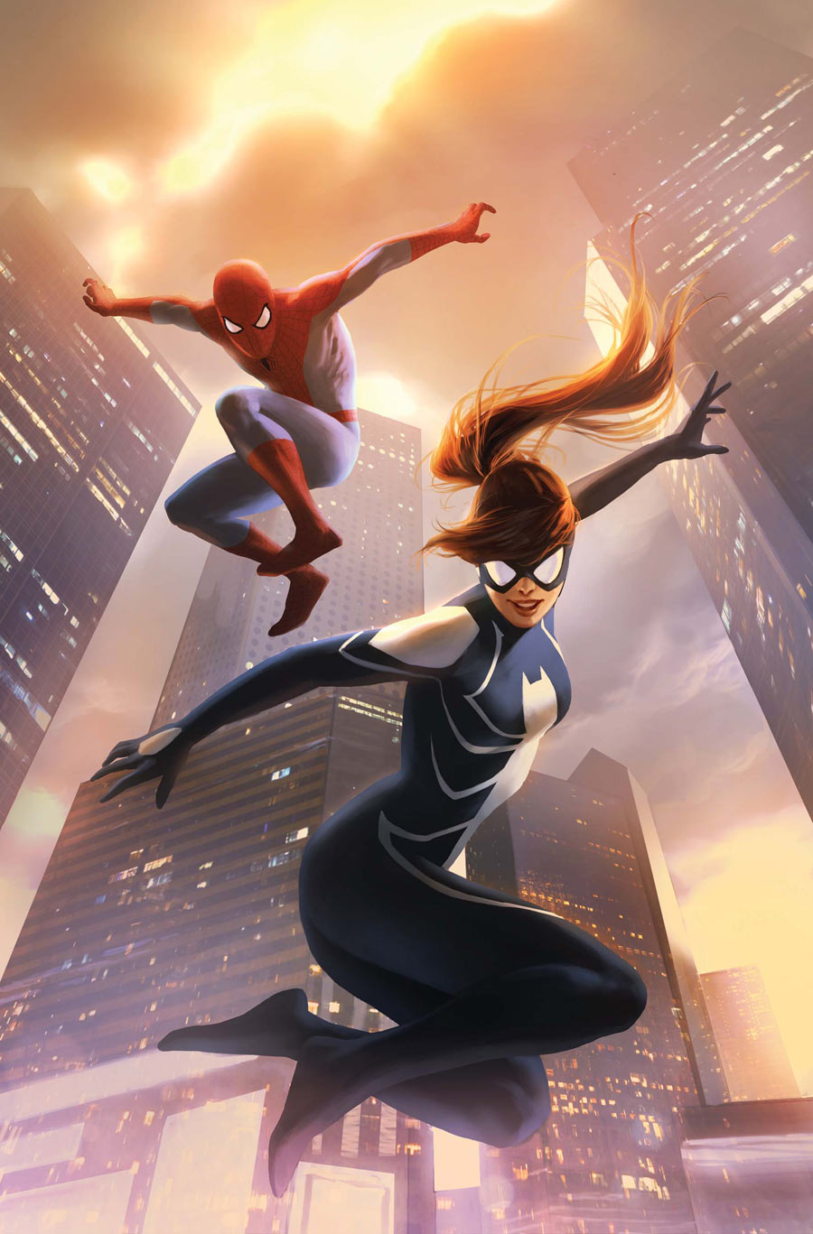 Description: A woman in a black and white suit flying through the air over a city with skyscrapers and a spider man.