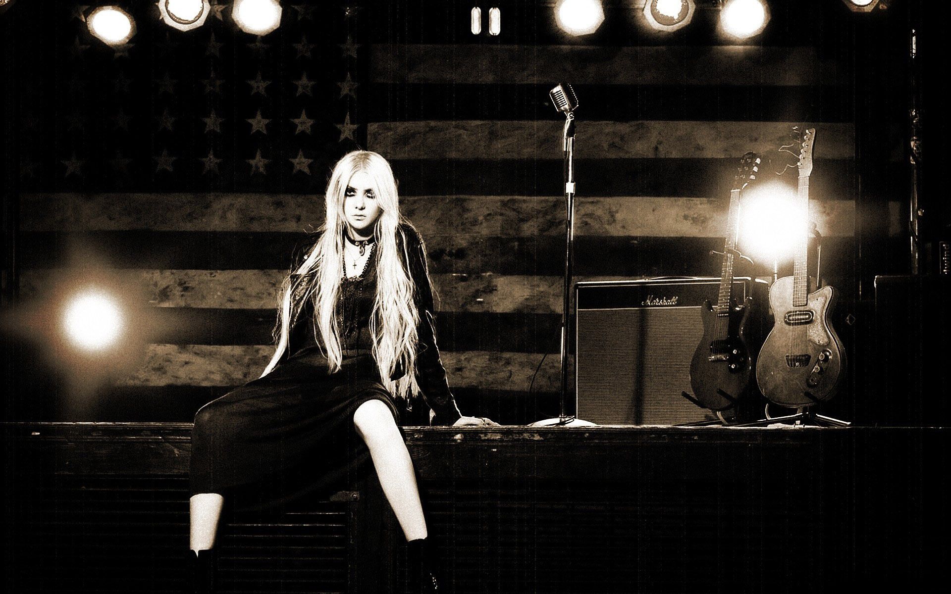 Description: A woman sitting on a stage with a microphone and a guitar in front of a flag and a microphone.