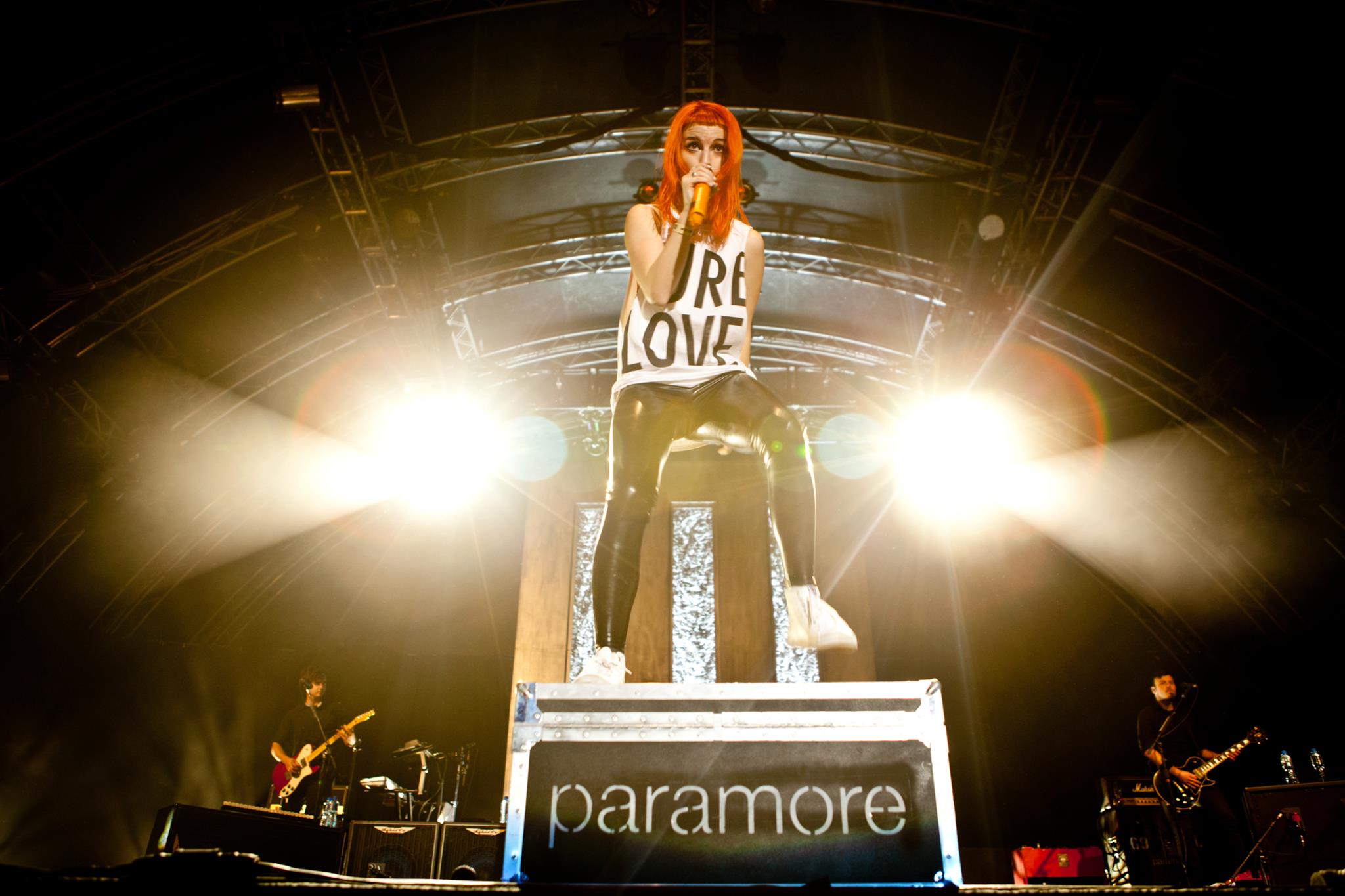 Description: A woman standing on top of a stage with a microphone in her hand and a sign in front of her.
