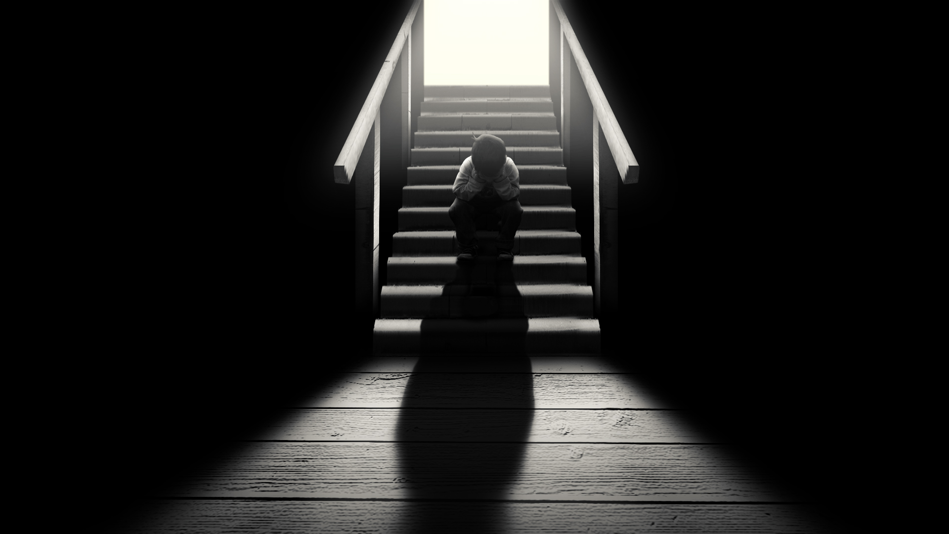 Description: A woman sitting on a stair case in the dark with a shadow of her head on the floor and a light coming through the door.