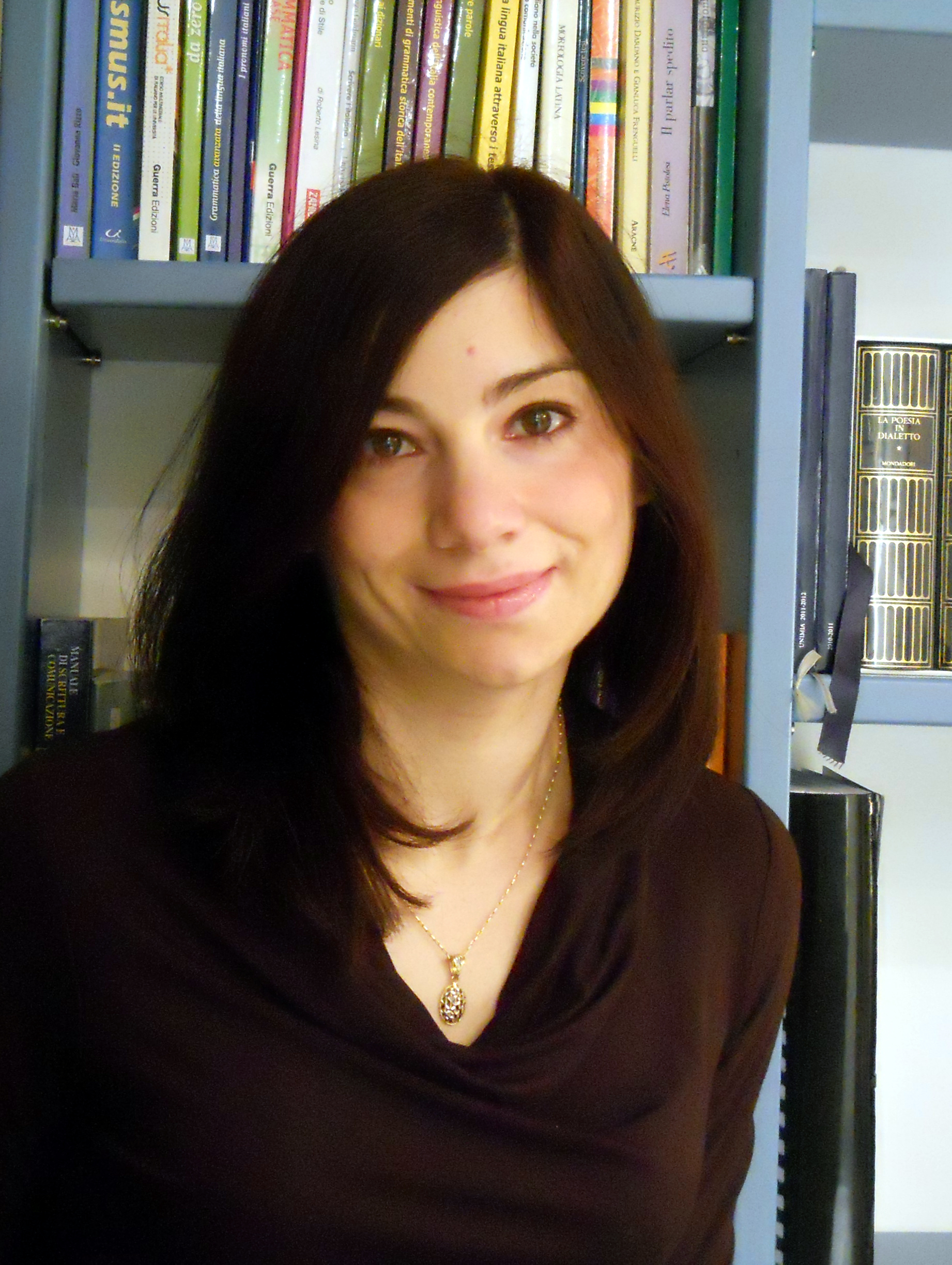 Description: A woman standing in front of a book shelf with books on it and a television in the background.