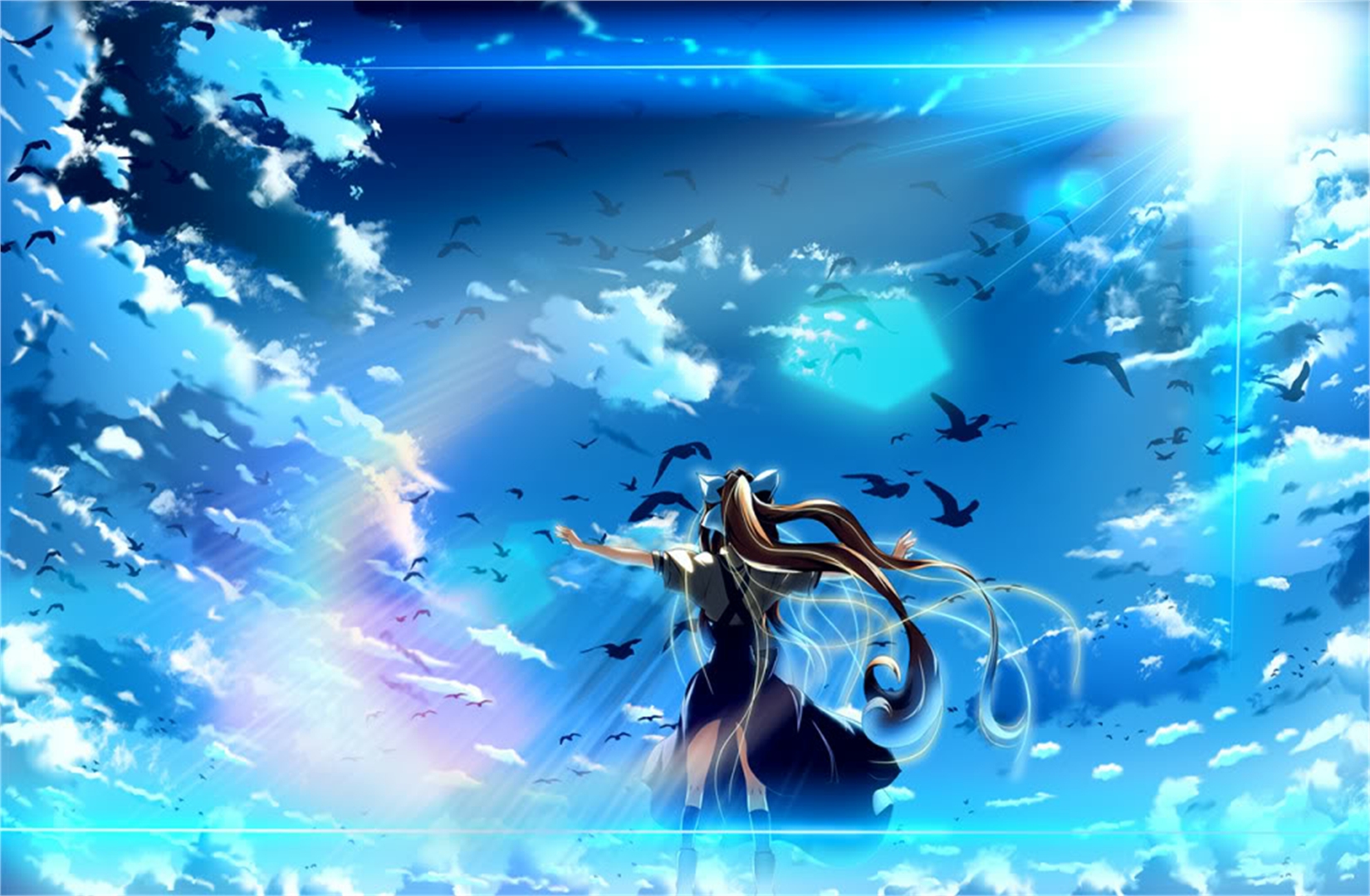 Description: A woman standing in the clouds with a sword in her hand and birds flying around her.