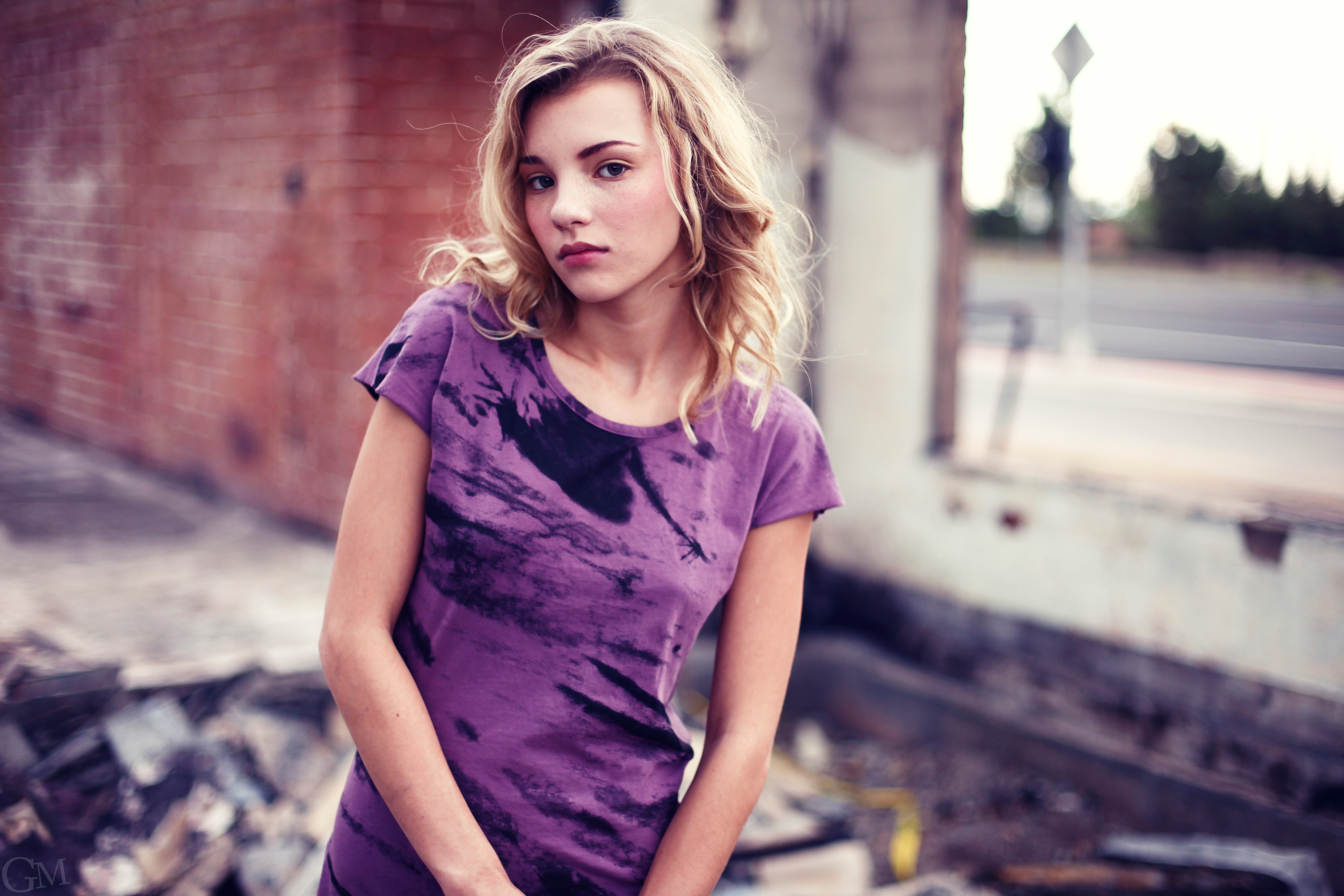 Description: A woman standing in front of a pile of junk and a building with a brick wall behind her and a brick wall behind her.