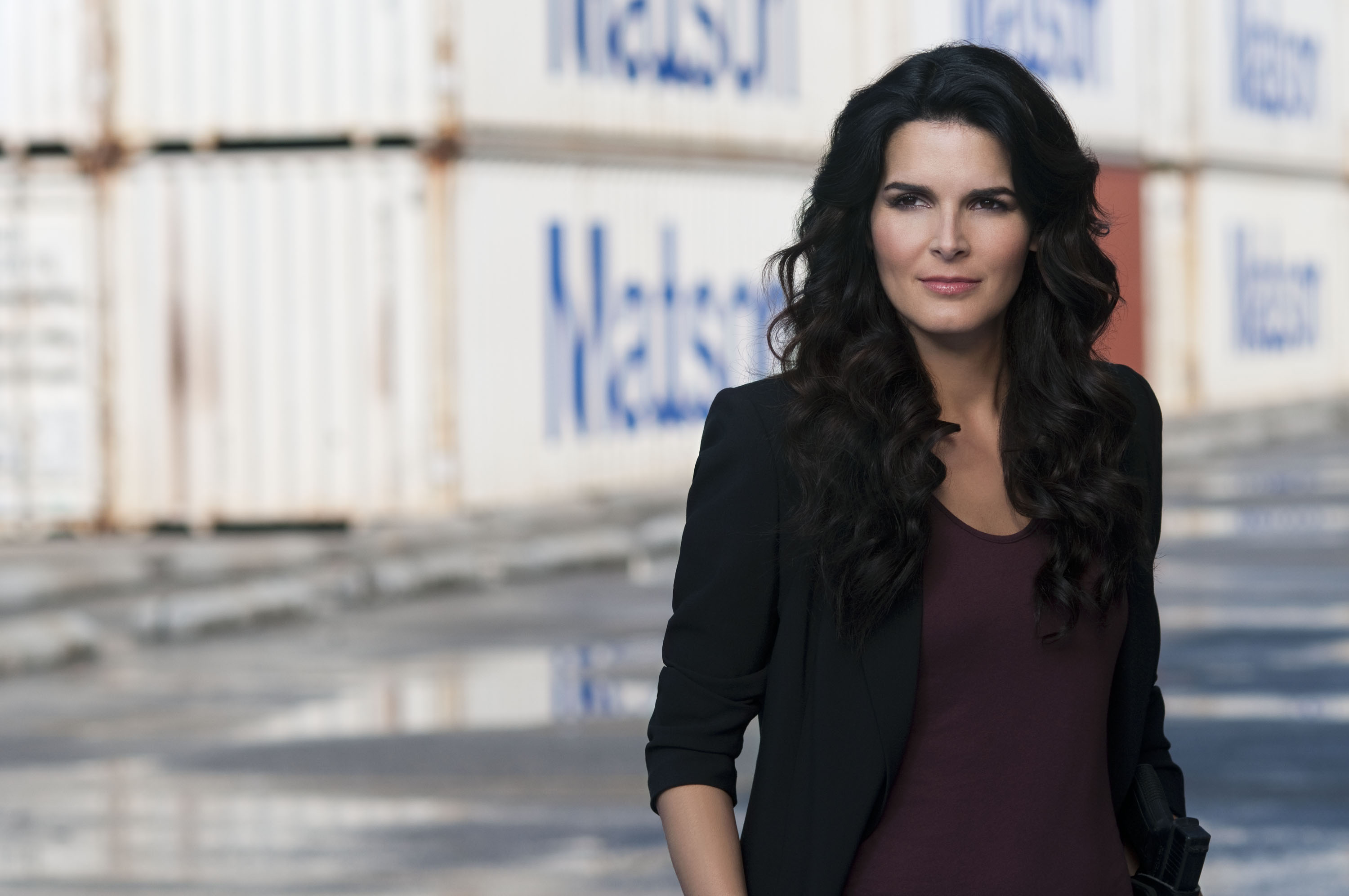 Description: A woman standing in front of a container of shipping containers with her hands in her pockets and her hand in her pocket.