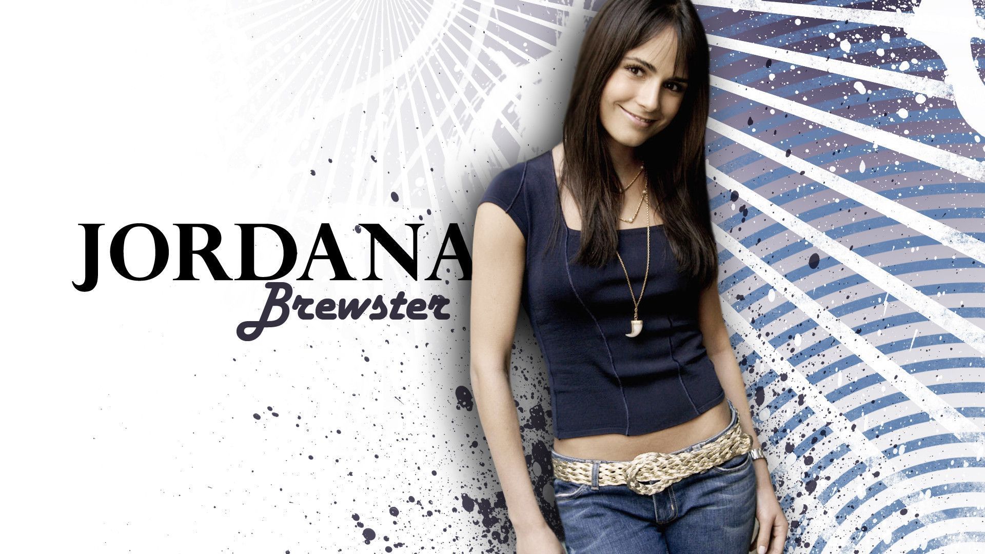 Description: A woman standing in front of a wall with a blue and white background and a name on it that says jordan.