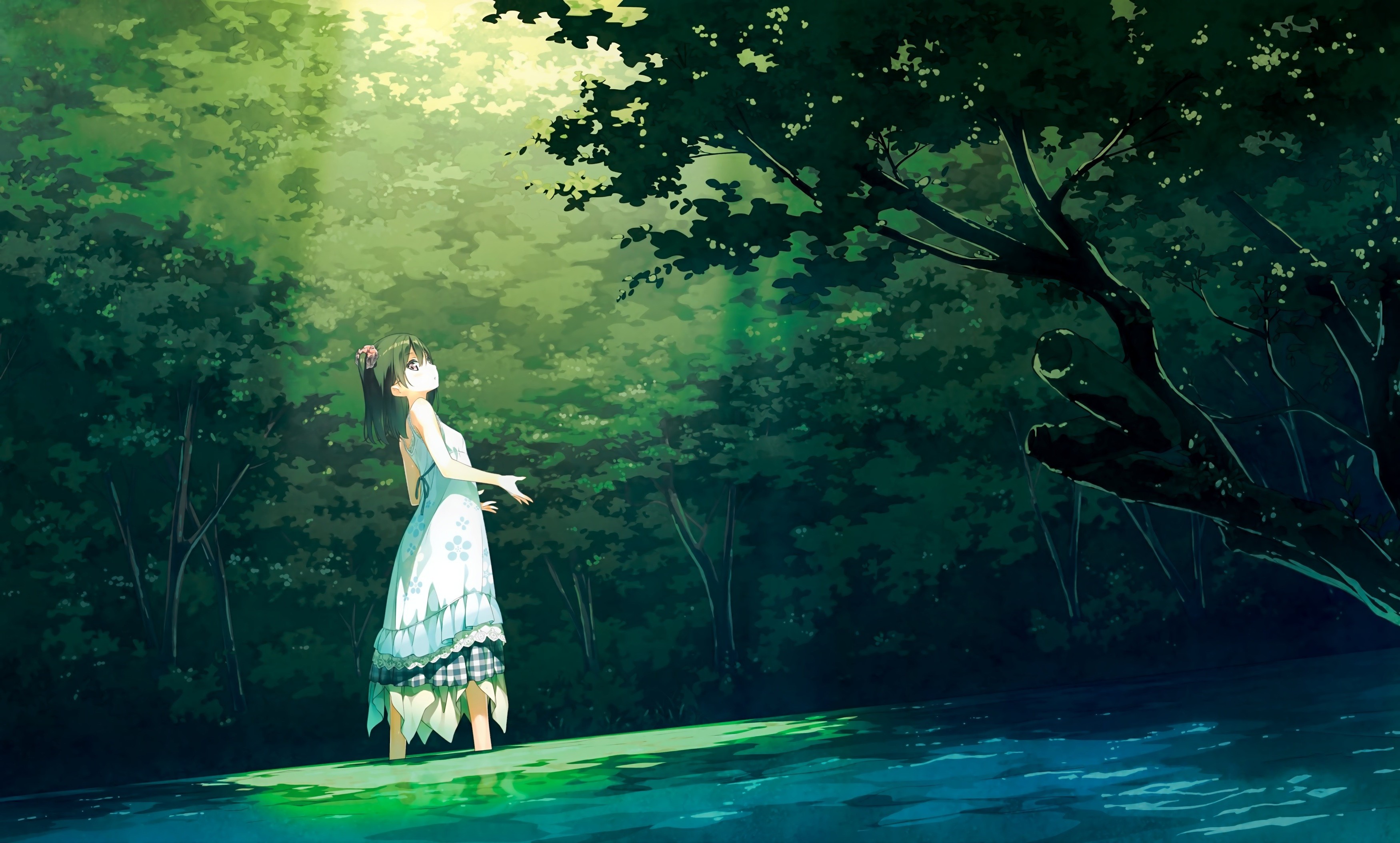 Description: A woman standing in the water looking at the trees and the sky above her head and a bird flying in the air.
