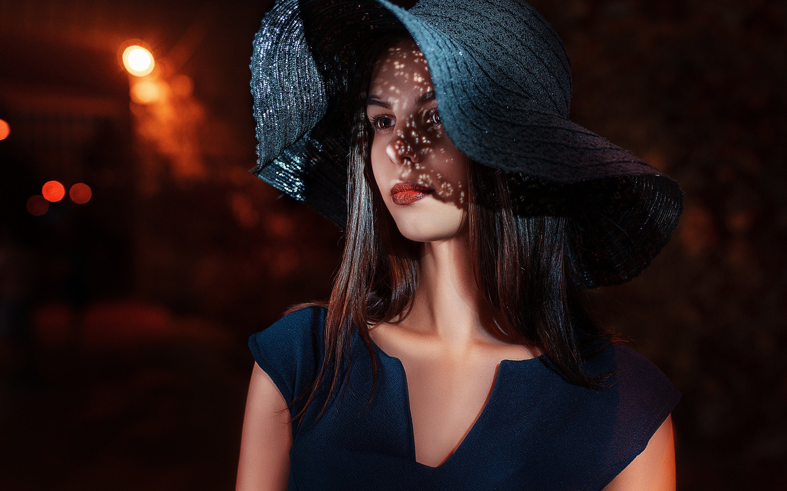 Description: A woman wearing a hat with a star on it's face and a black dress and hat with a blue top.
