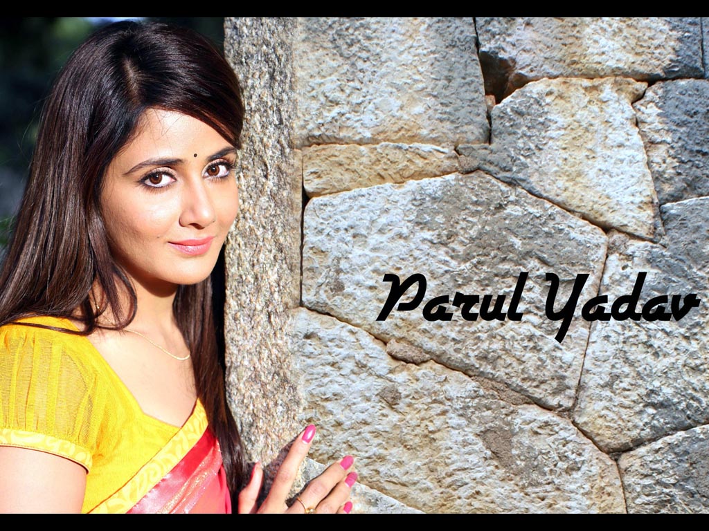 Description: A woman leaning against a stone wall with the words parul yadar written on it in black and white.