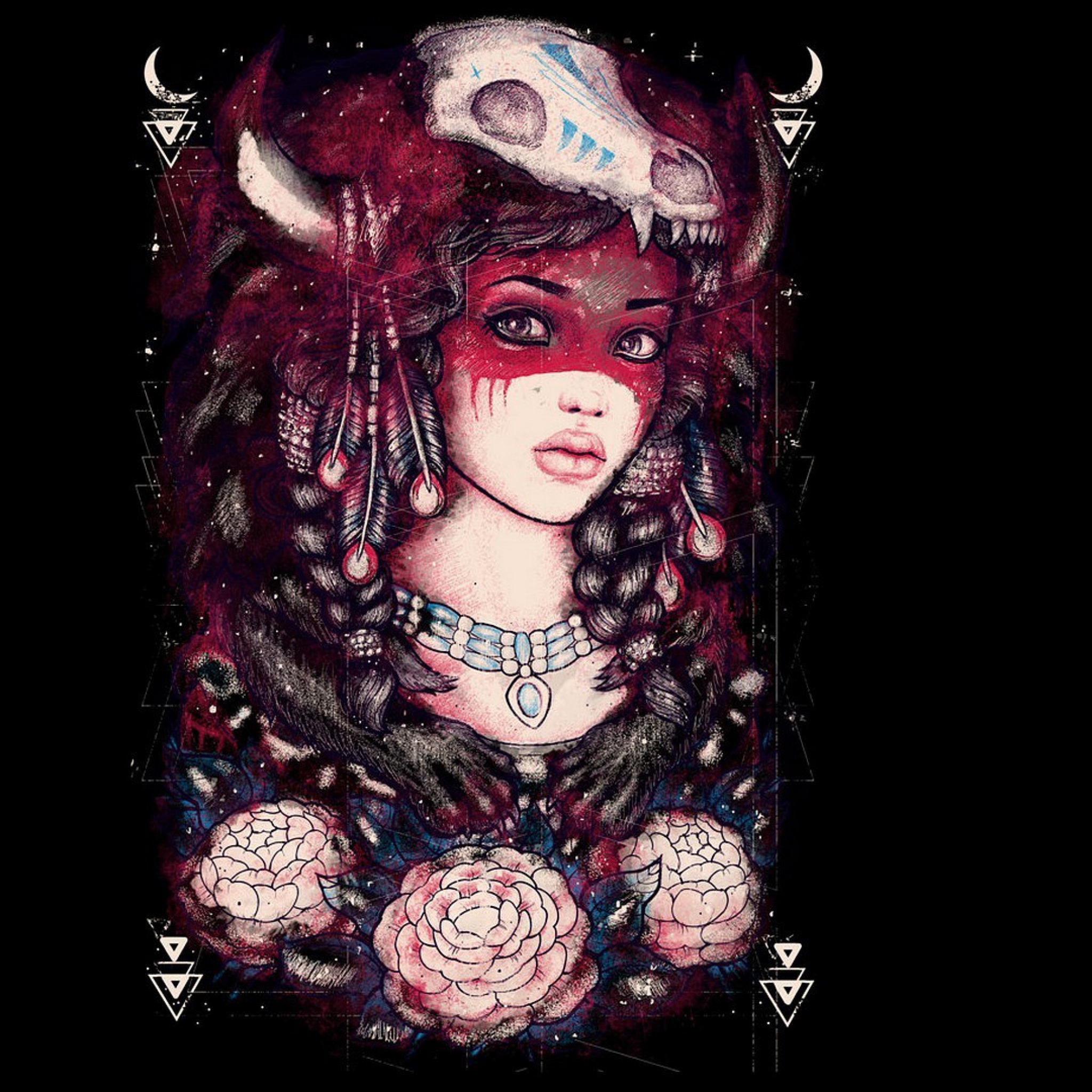 Description: A woman with a strange hat and a feather on her head and a flower in her hand and a moon in her hair.