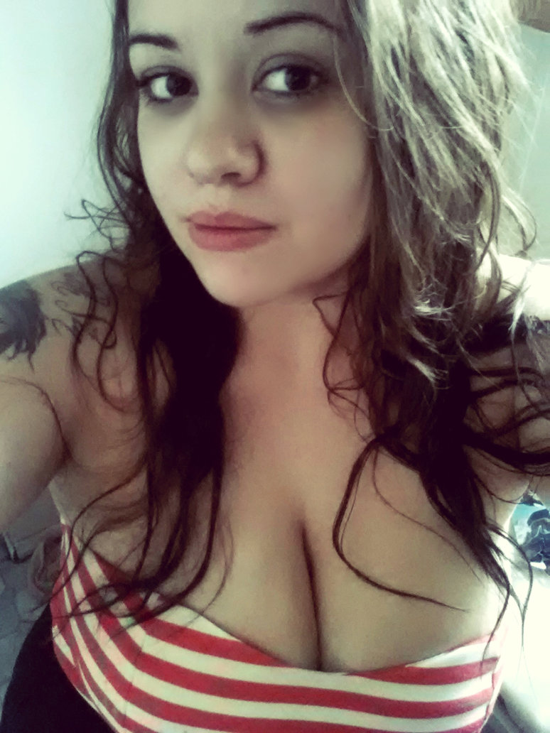 Description: A woman with big breast wearing a striped top and black pants and a tattoo on her arm and chest.