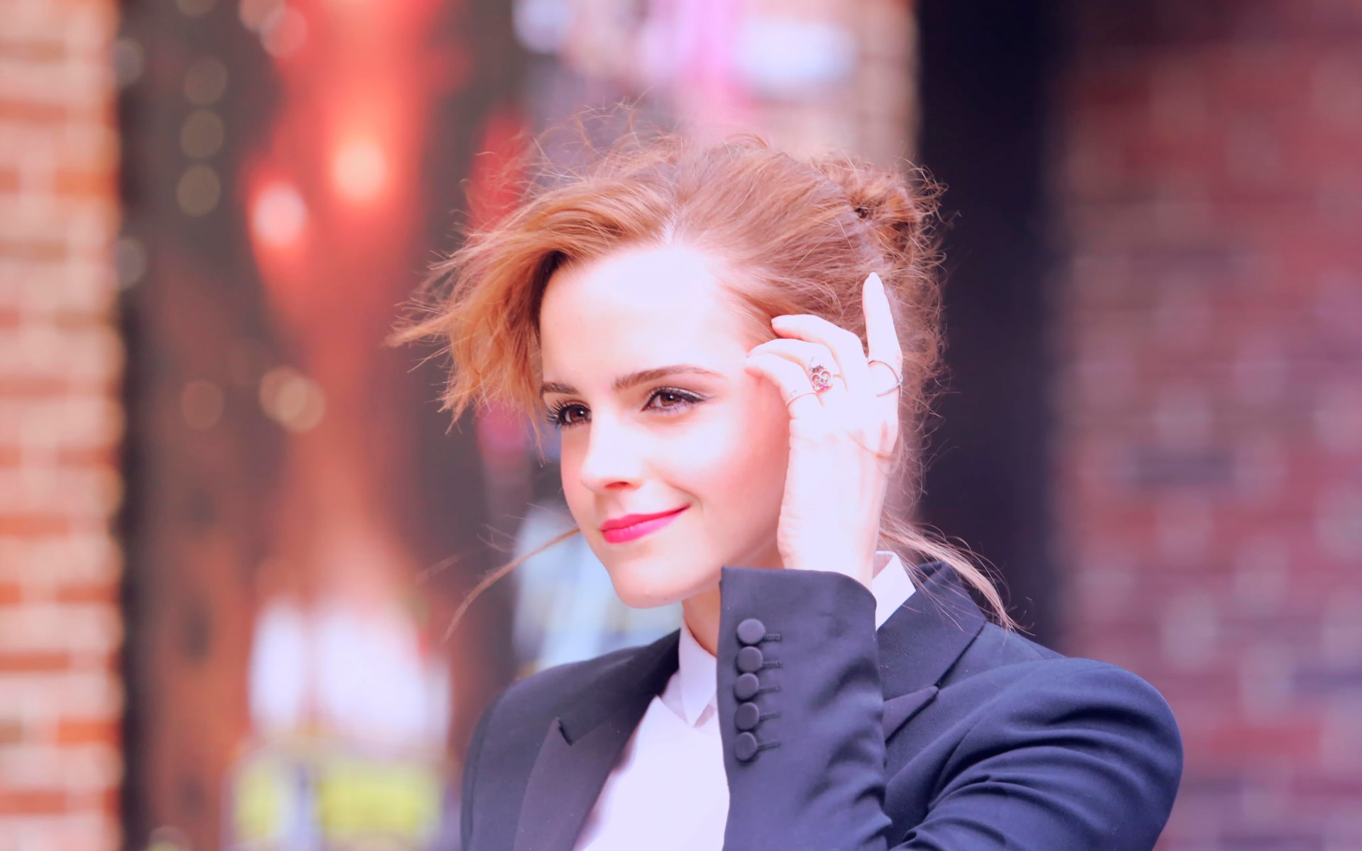 Description: A woman in a suit talking on a cell phone while standing outside of a building with a brick wall.