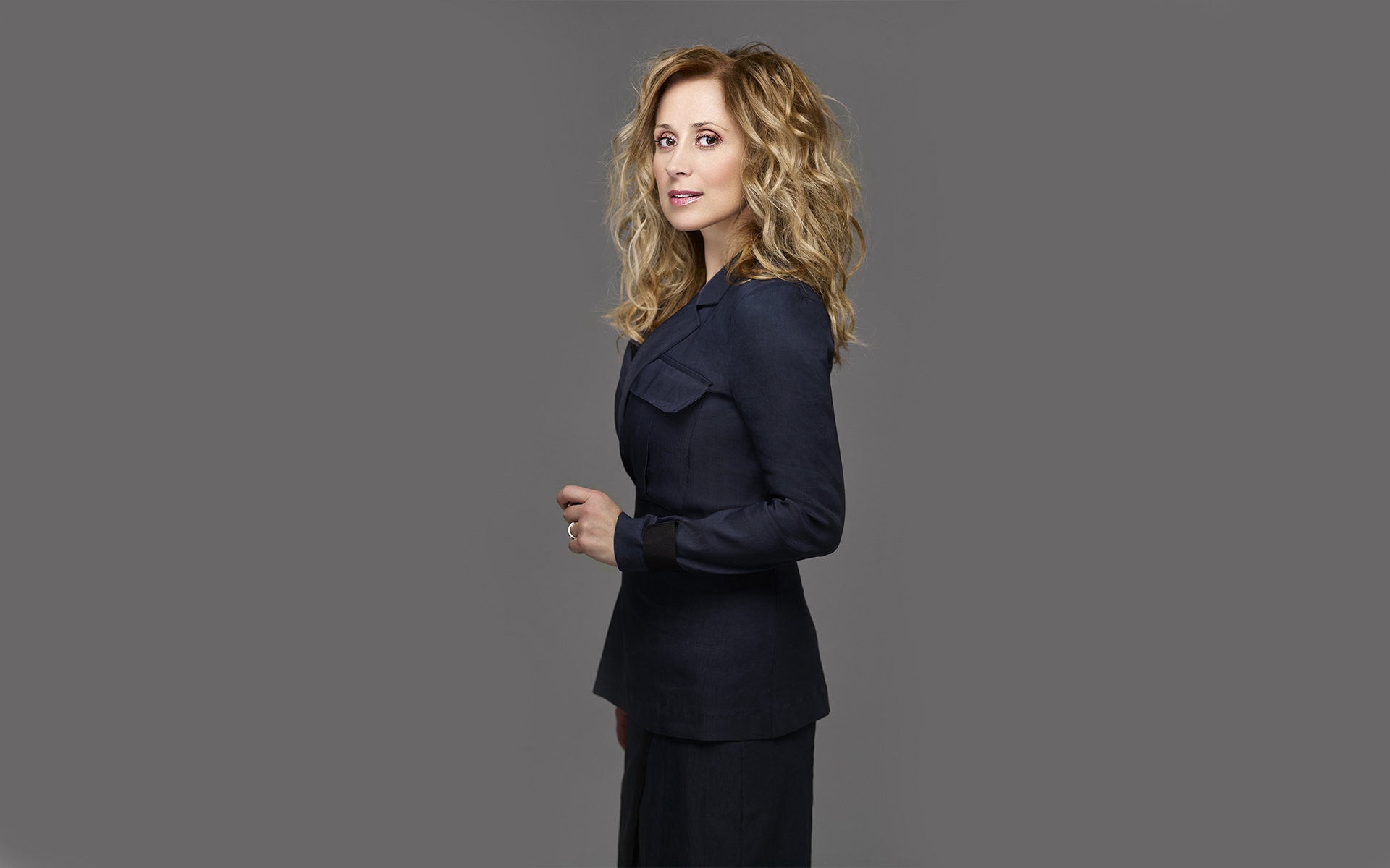 Description: A woman in a suit standing with her hands on her hips and looking at the camera with a serious look on her face.