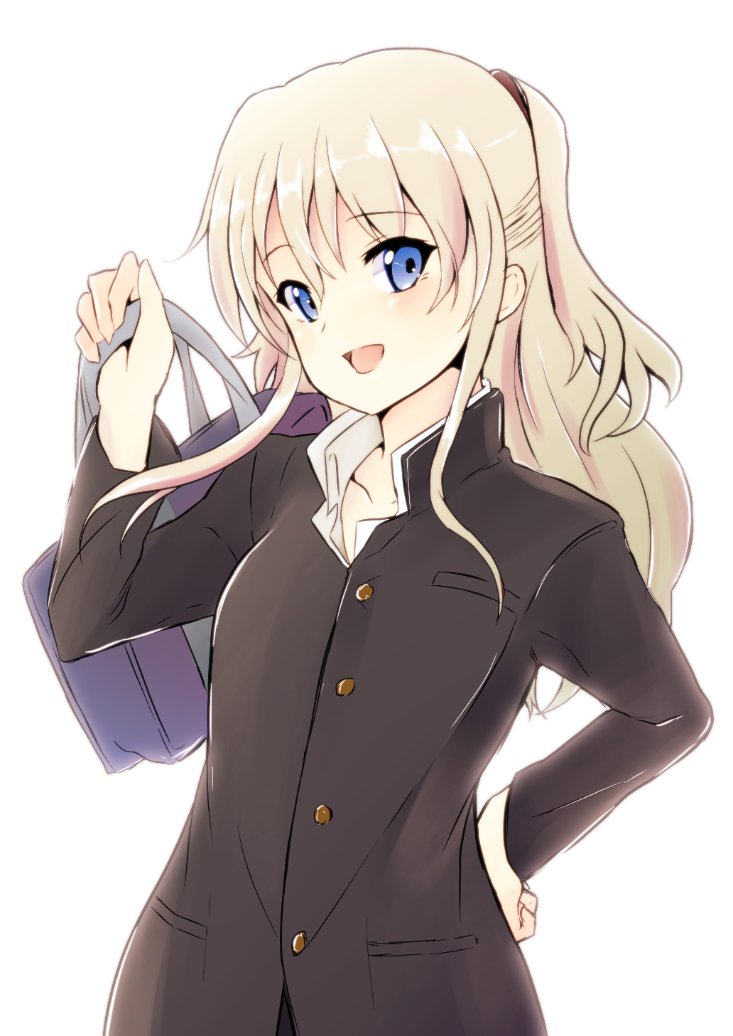Description: A woman in a suit holding a purse and a handbag with a long white hair and blue eyes.