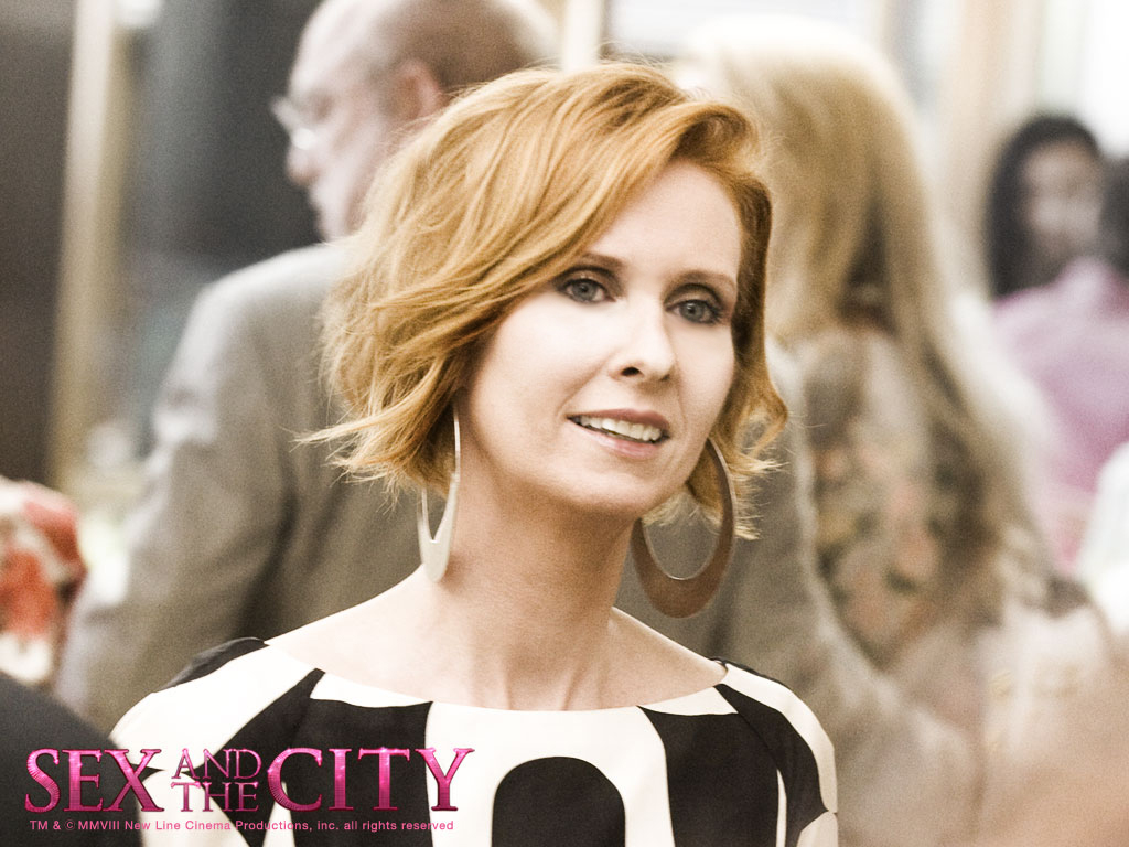 Description: A woman with a black and white dress and a man in a suit and tie and a woman with a red hair and earrings.