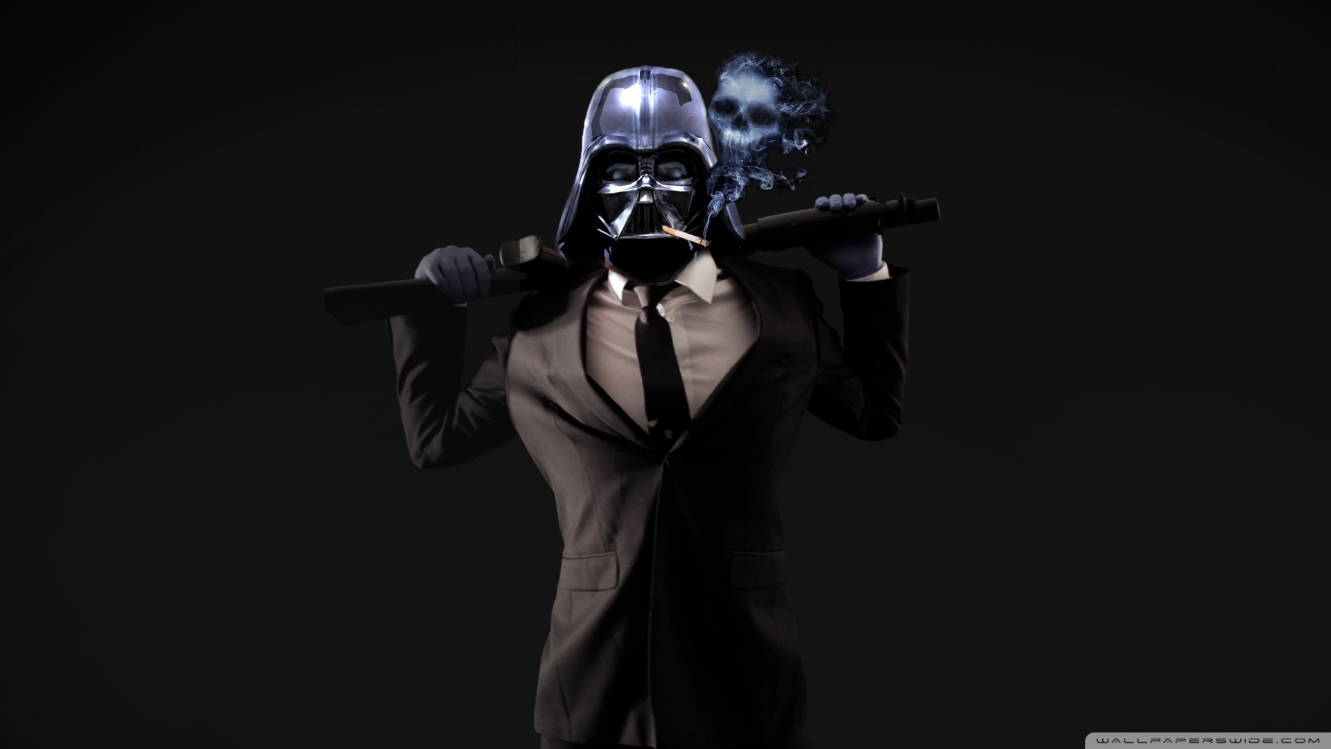 Description: A woman in a suit and tie holding a cigarette and a darth vader mask on her head.