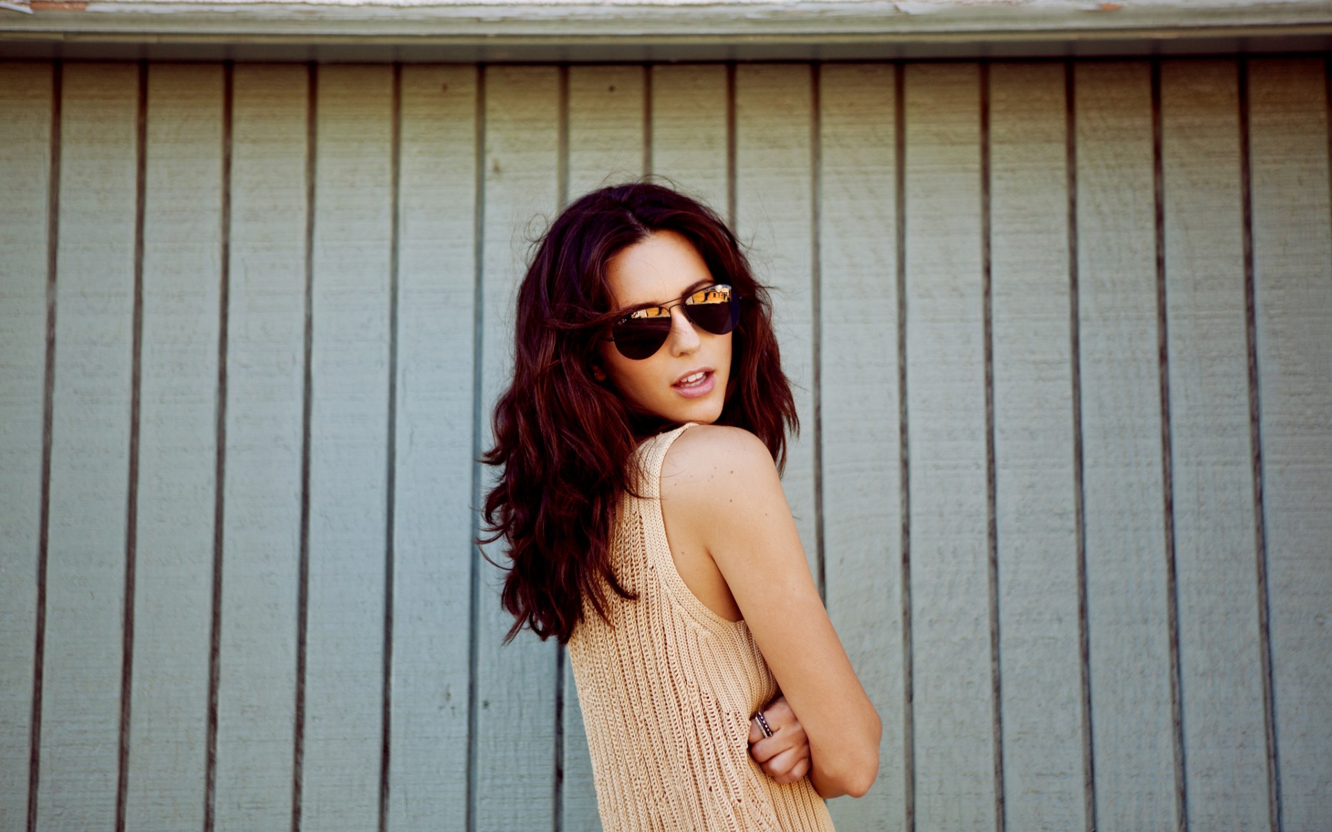 Description: A woman wearing sunglasses standing in front of a building with a suitcase in her hand and a handbag in her other hand.