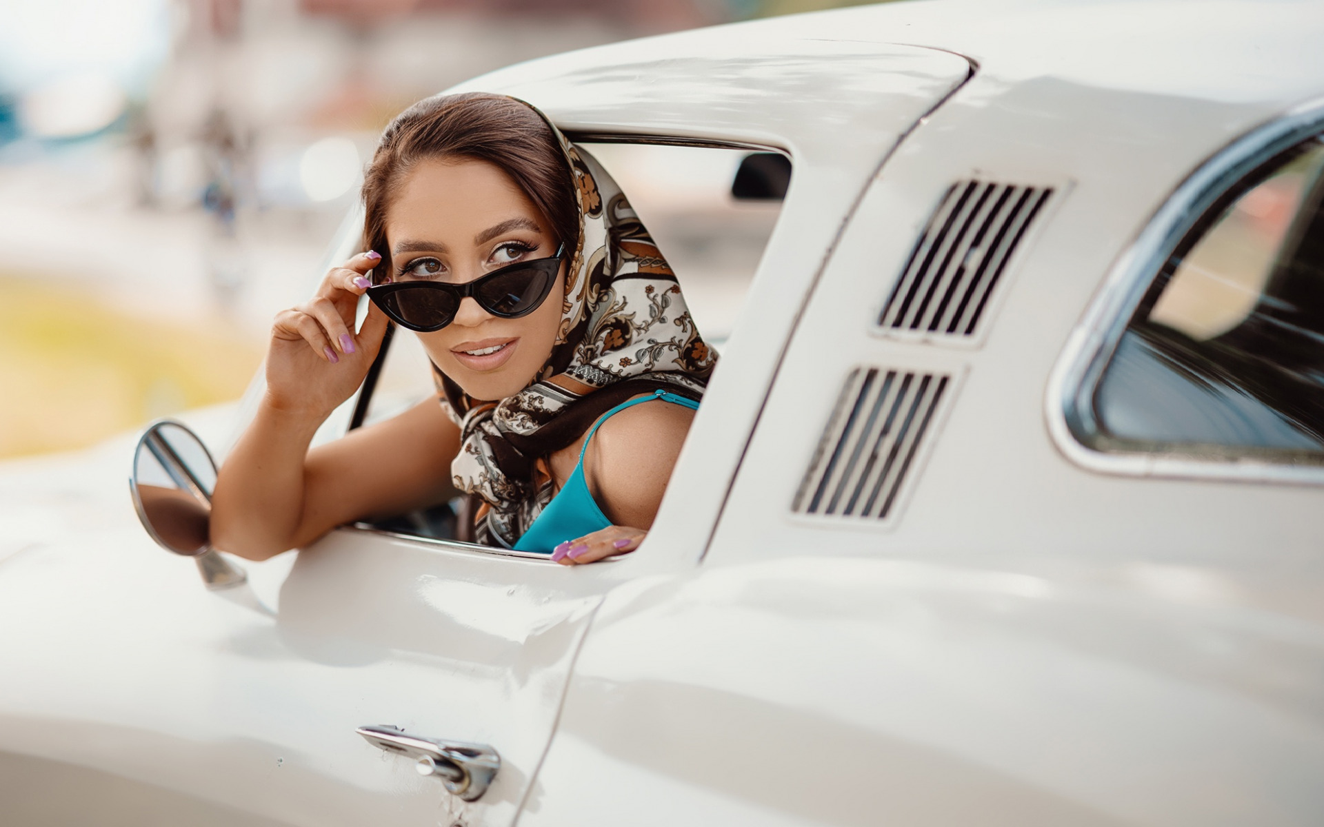Description: A woman in sunglasses is sitting in a car and talking on a cell phone while wearing a scarf and scarf around her neck.