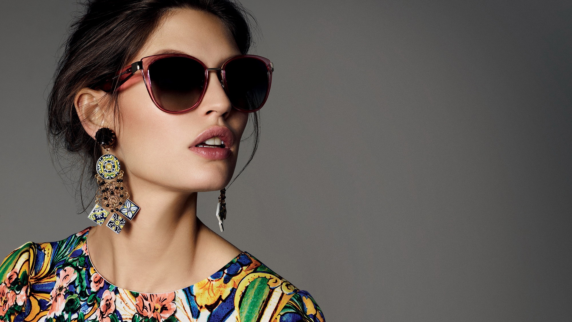 Description: A woman wearing sunglasses and a colorful dress with a flowered top and earrings on her head and a gray background.
