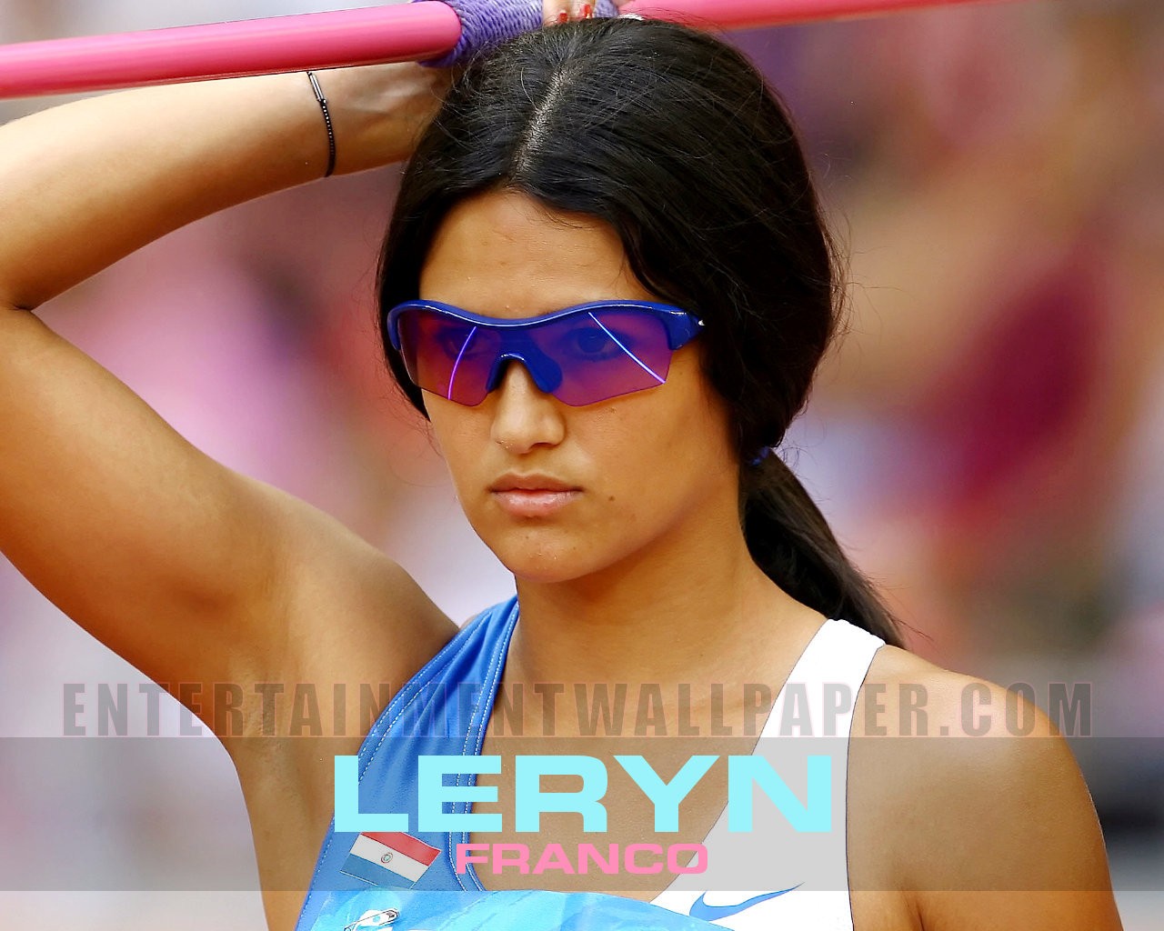 Description: A woman with sunglasses on holding a pink pole over her head and looking at the camera with a serious look on her face.