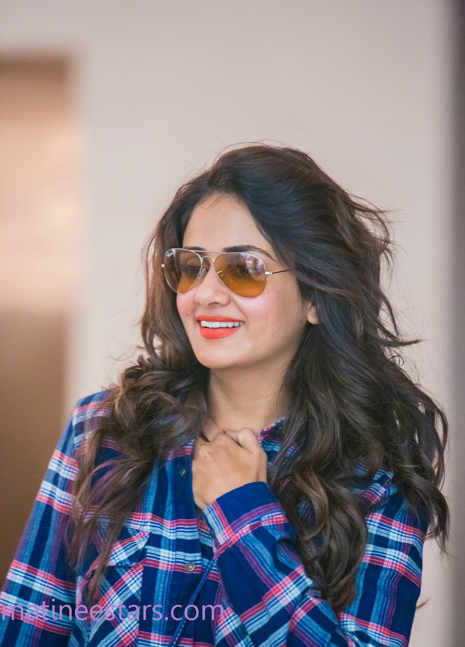 Description: A woman wearing sunglasses and a plaid shirt smiling at the camera with her hands on her chest and her hand on her chest.