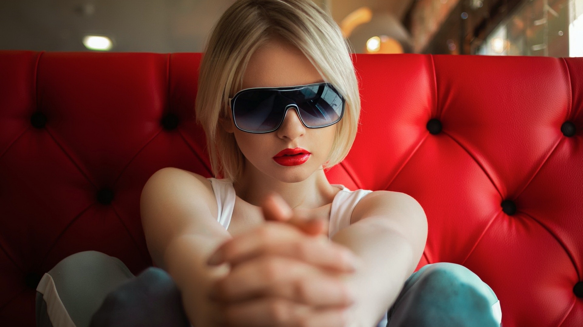 Description: A woman wearing sunglasses sitting on a red couch pointing at the camera with her finger on her lips and a red chair behind her.