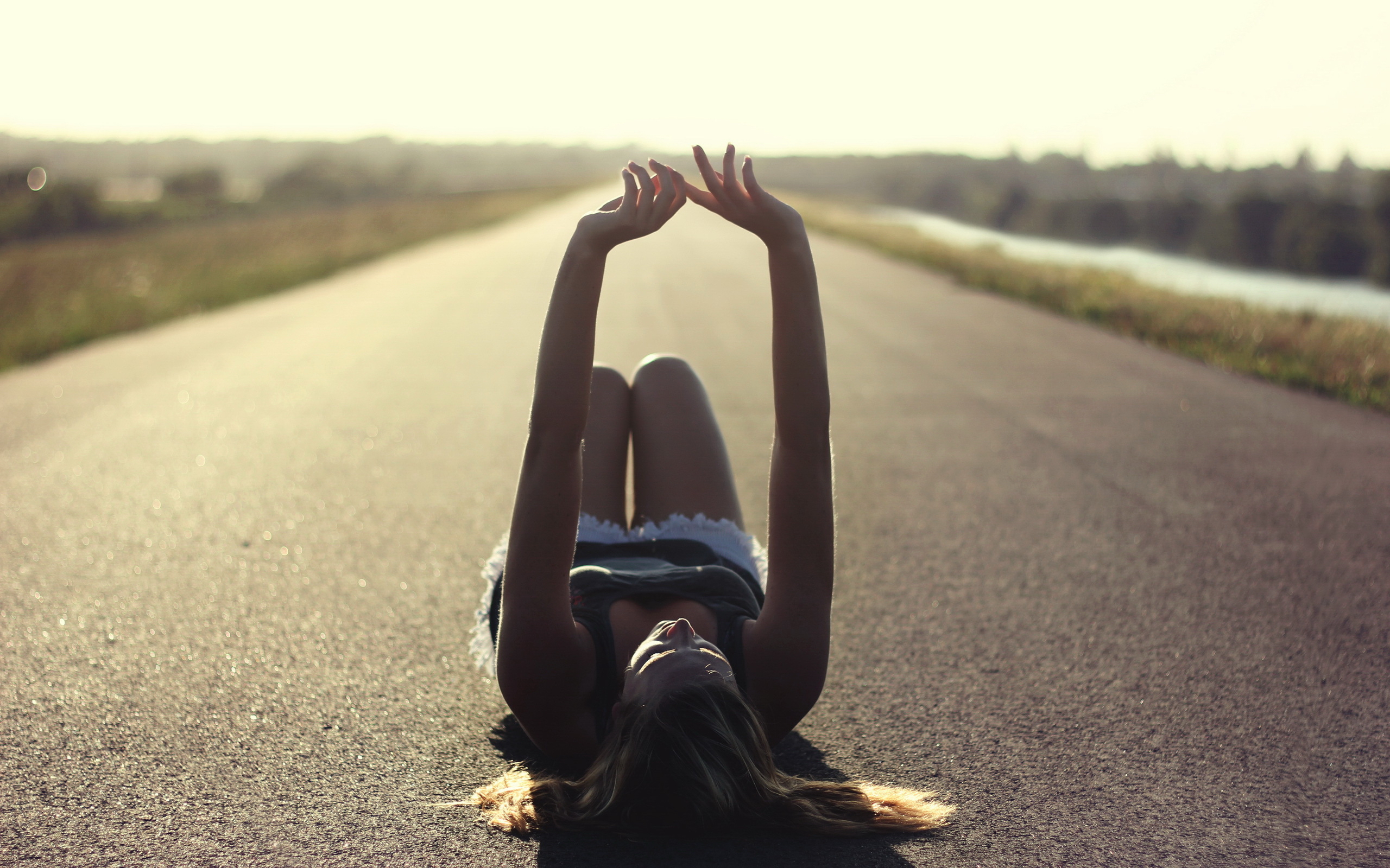 Description: A woman laying on the side of a road with her hands up in the air and her head in the air.