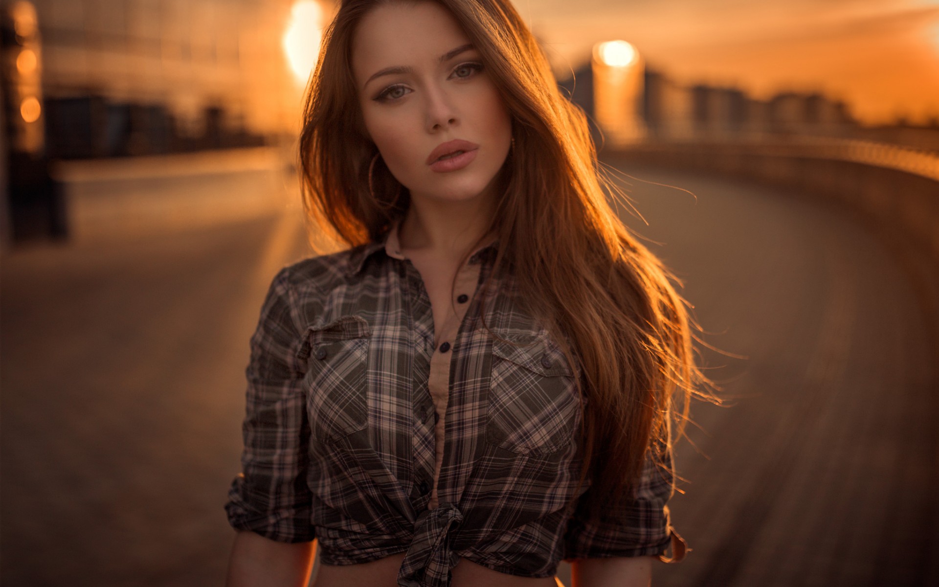 Description: A woman standing on a road with her hair blowing in the wind and a sunset in the background with buildings.