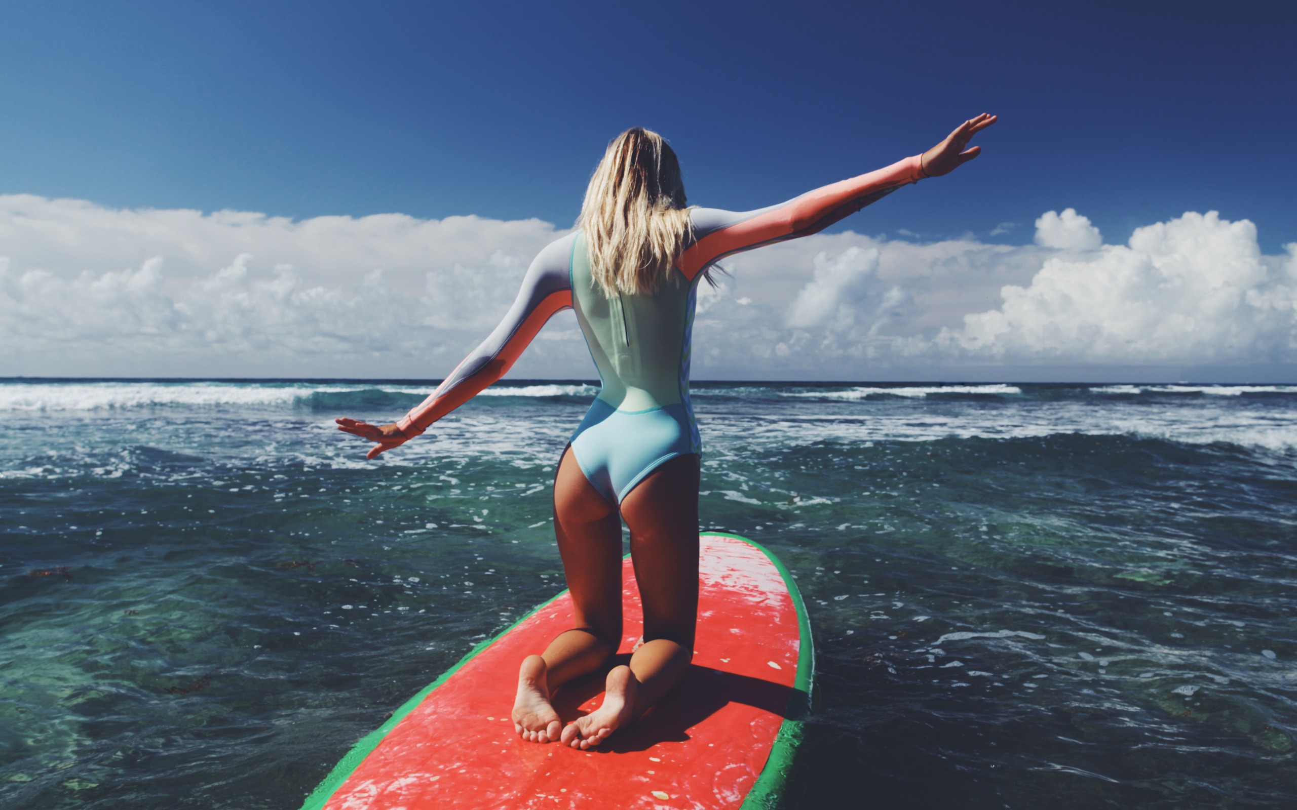 Description: A woman in a green and blue swimsuit standing on a surfboard in the ocean with her arms outstretched.