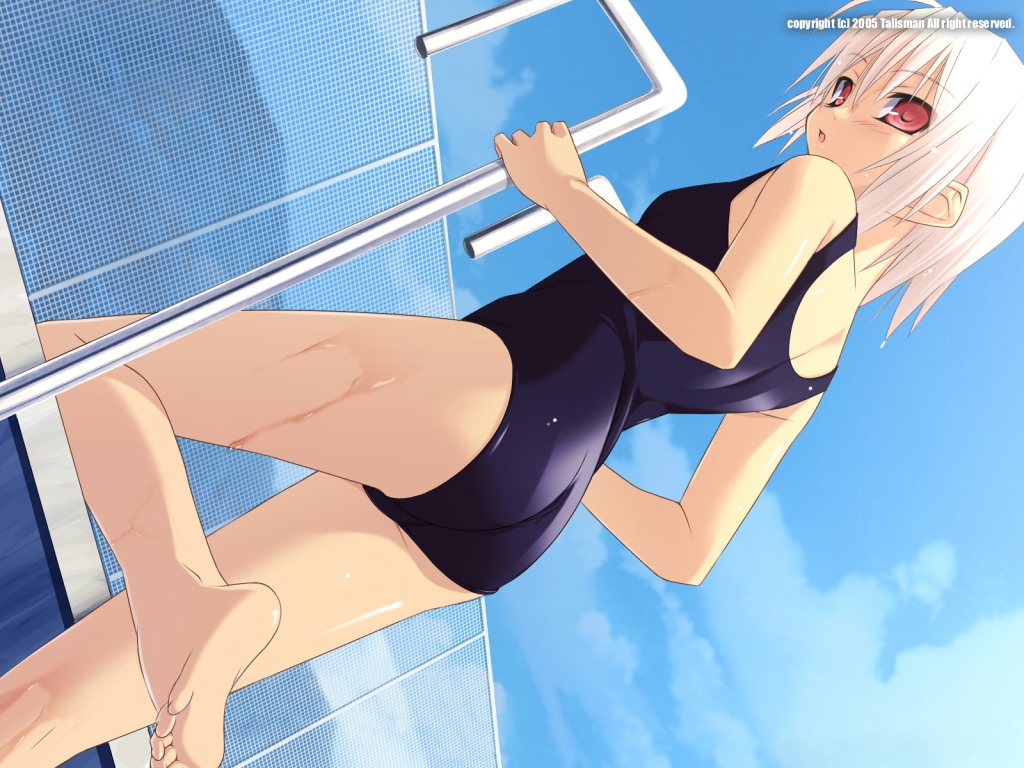 Description: A woman in a swimsuit leaning against a wall with a towel on her back and a towel hanging off of her back.