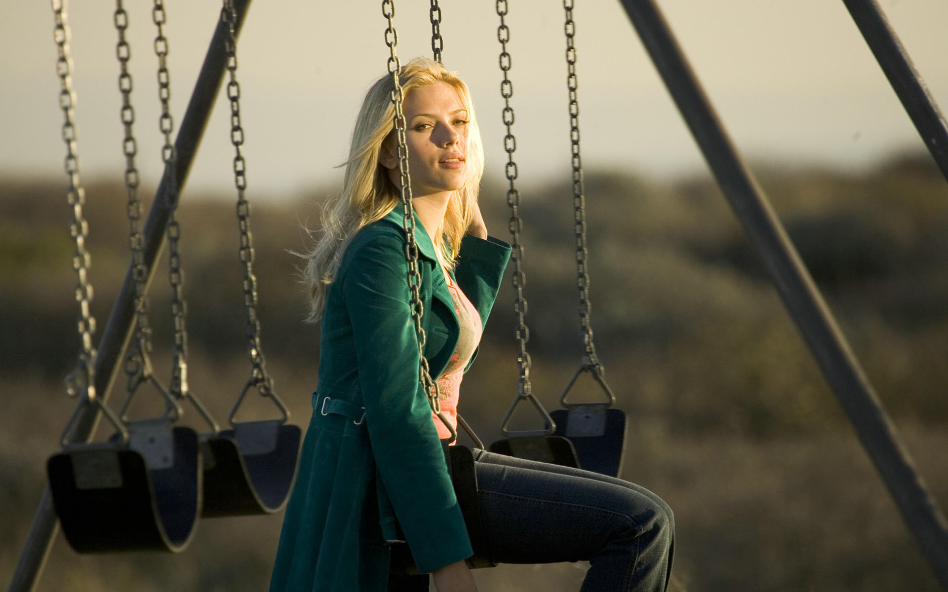 Description: A woman sitting on a swing in a park with a green coat on and a green shirt on and a green coat on.