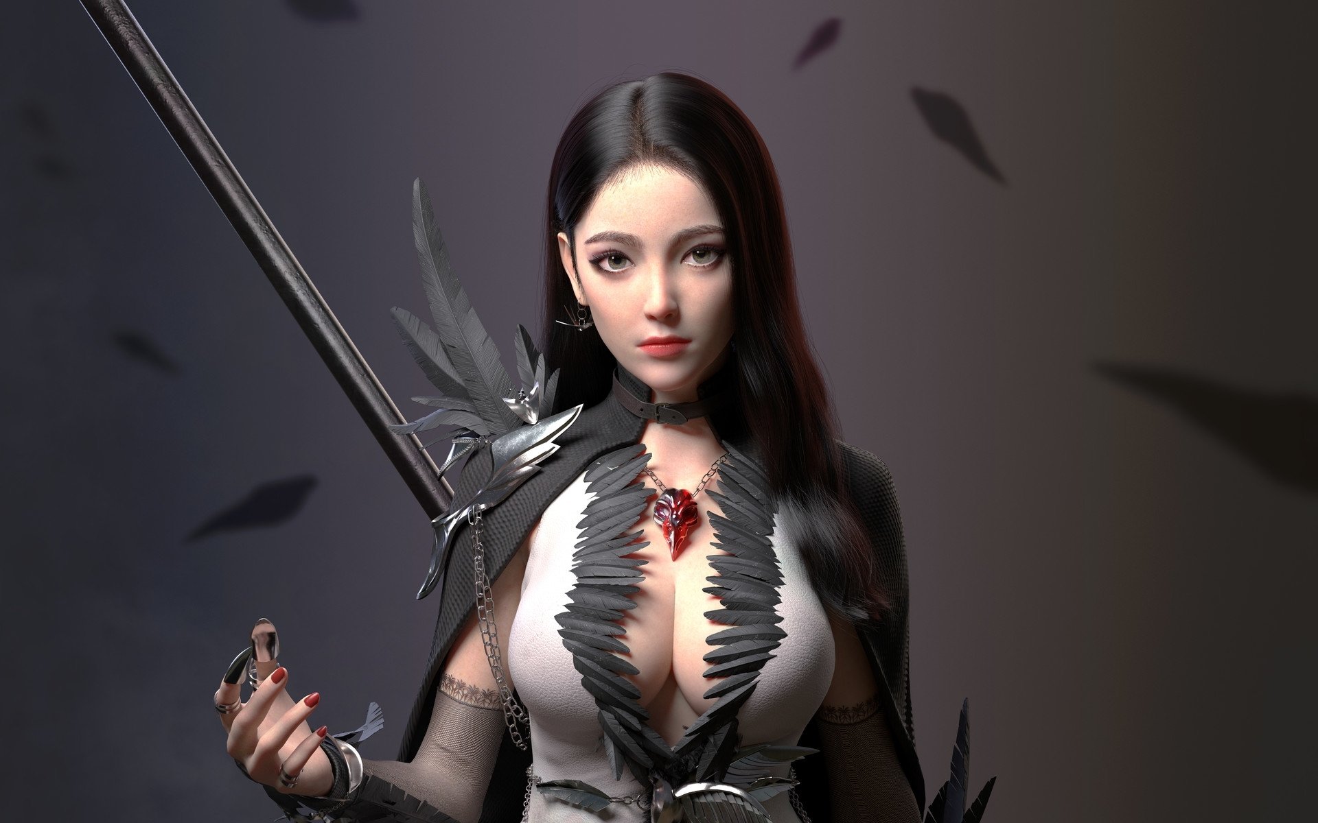 Description: A woman with a sword and a bird costume on holding a sword and a bird on her shoulder and a bird on her shoulder.